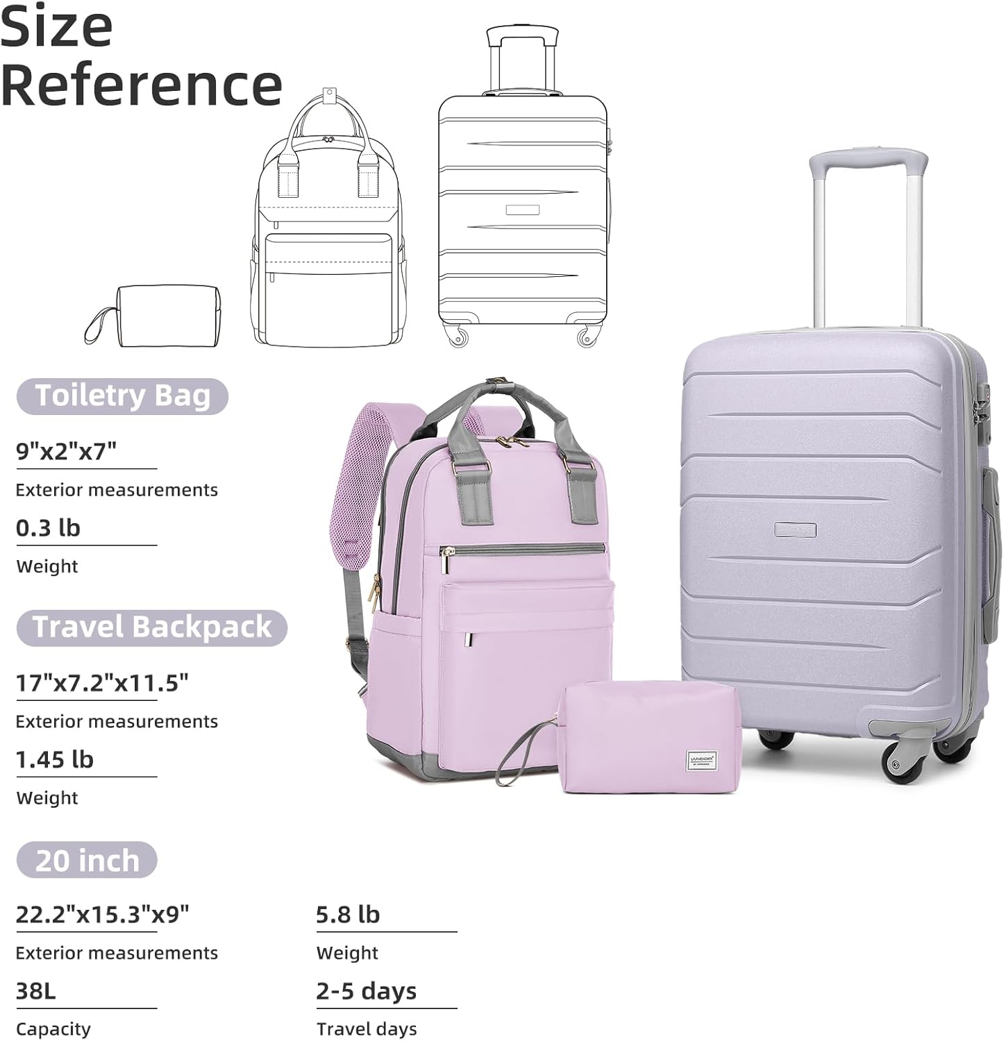 【3-Piece Suitcase Set】Carryon luggage 22x14x9 airline approved includes a 20-inch carry-on suitcase (no additional expansion layers), a travel backpack and a toiletry bag—perfect for short trips or extended journeys