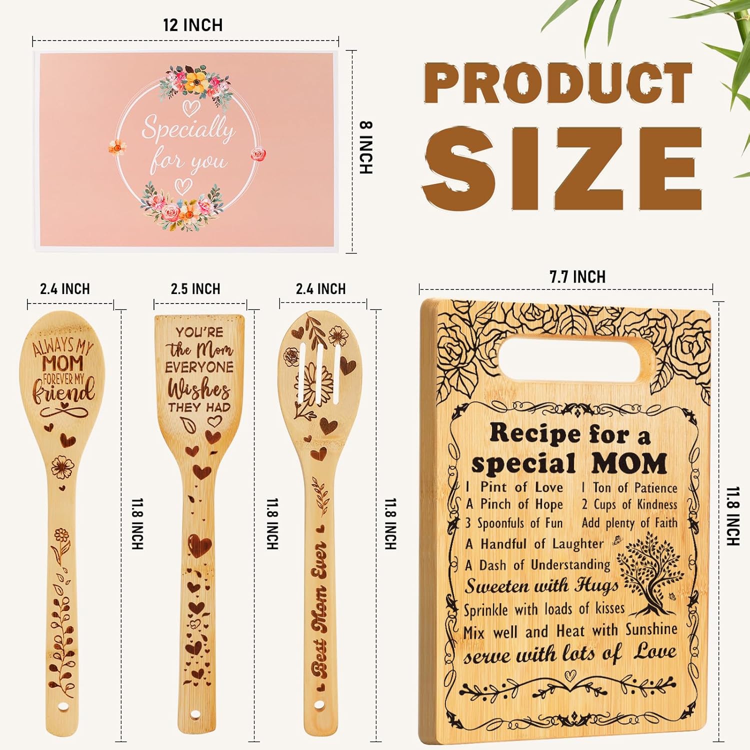 【Perfect Kitchen Christmas Gift for Mom】: This beautiful mom cutting board combo set gift with 4 bamboo tableware, you can get one cutting board, one soup spoon, one slotted spoon, and one spatula. NOTE: As it is a bamboo product, we cannot guarantee that the color of each board is exactly the same as the sample picture, but it will not be very different.