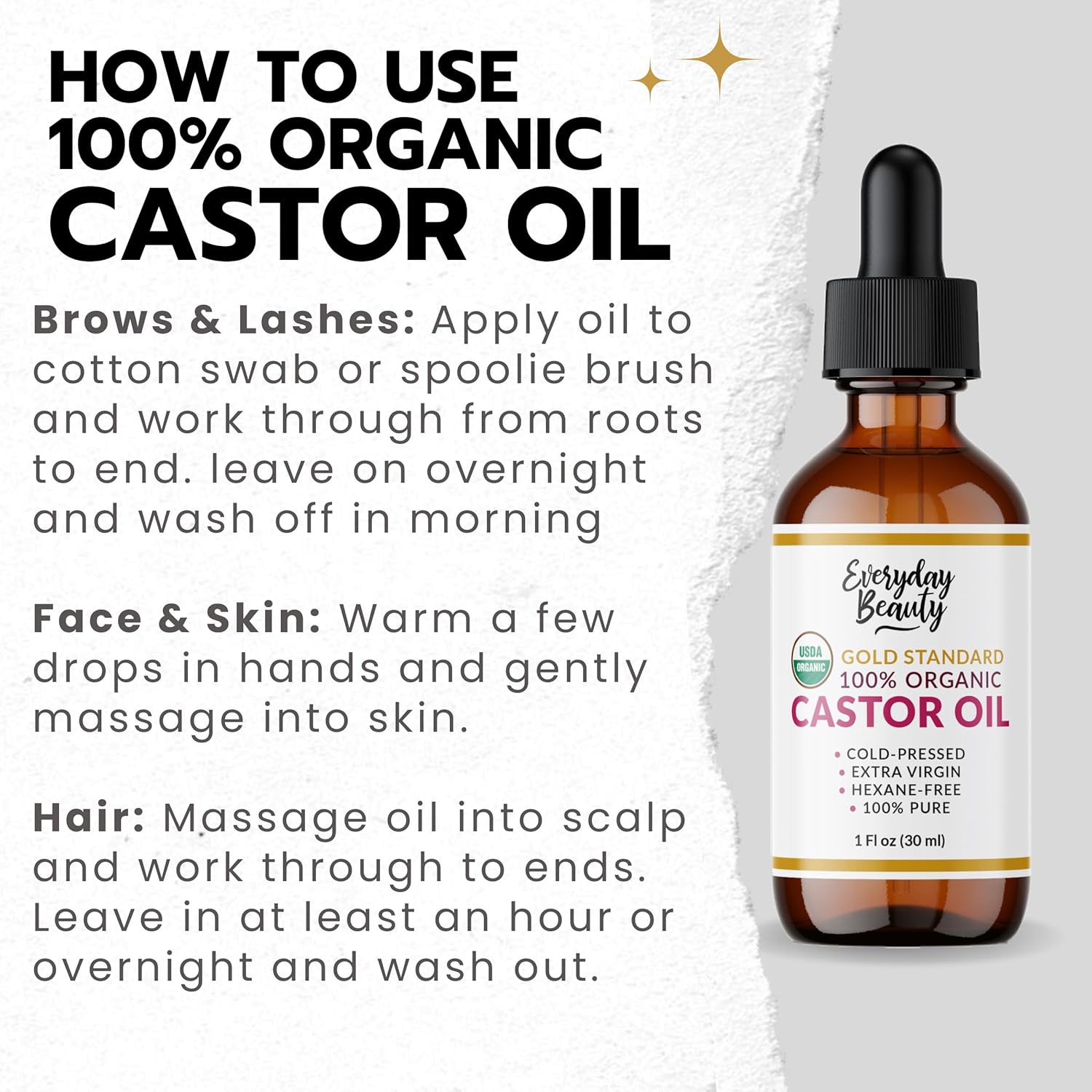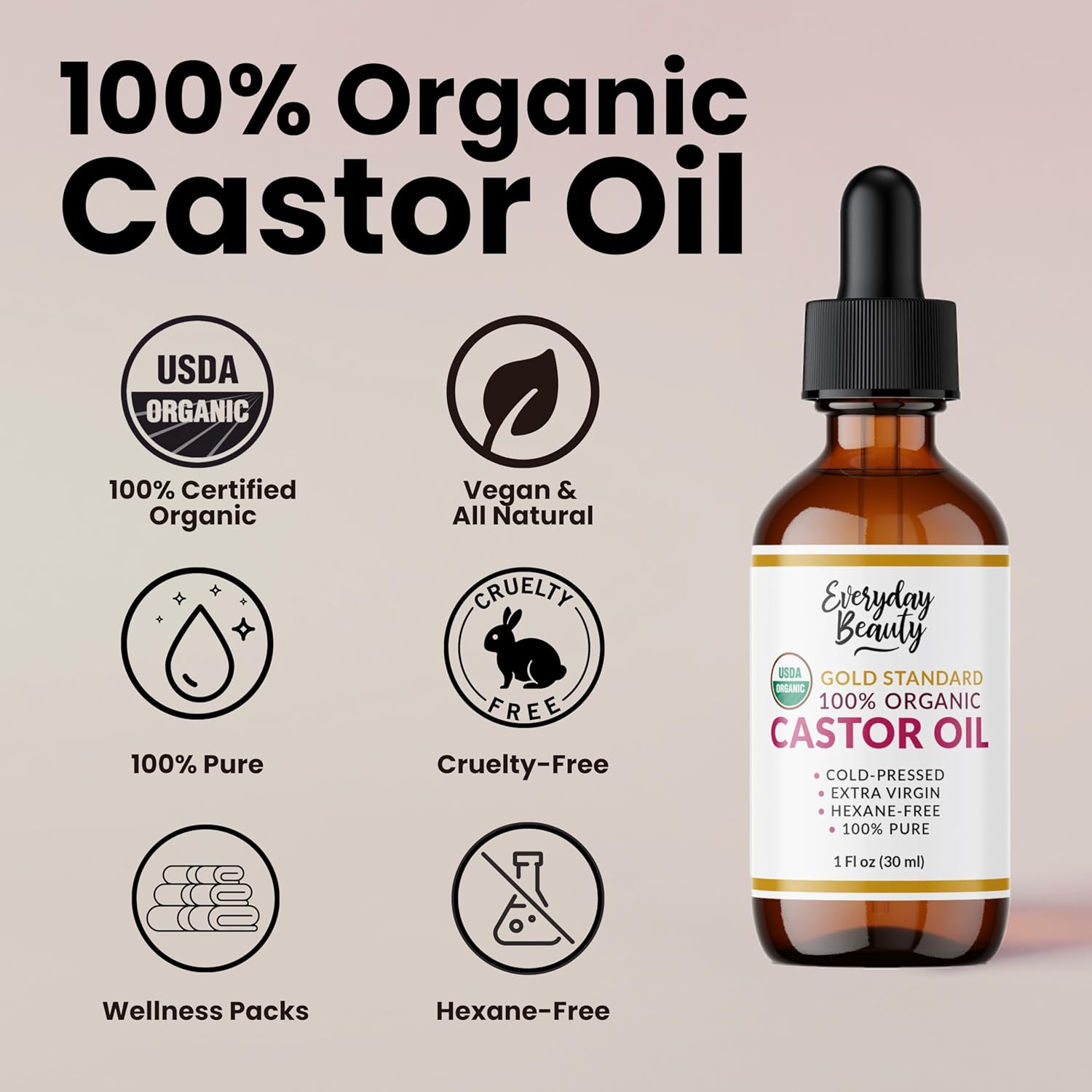 100% Organic Castor Oil – Gold Standard 100% Pure Certified USDA Organic in Glass Bottle & Glass Dropper, Cold Pressed & Hexane-Free, For Lashes, Brows, Hair, Skin & Wellness Packs -1oz