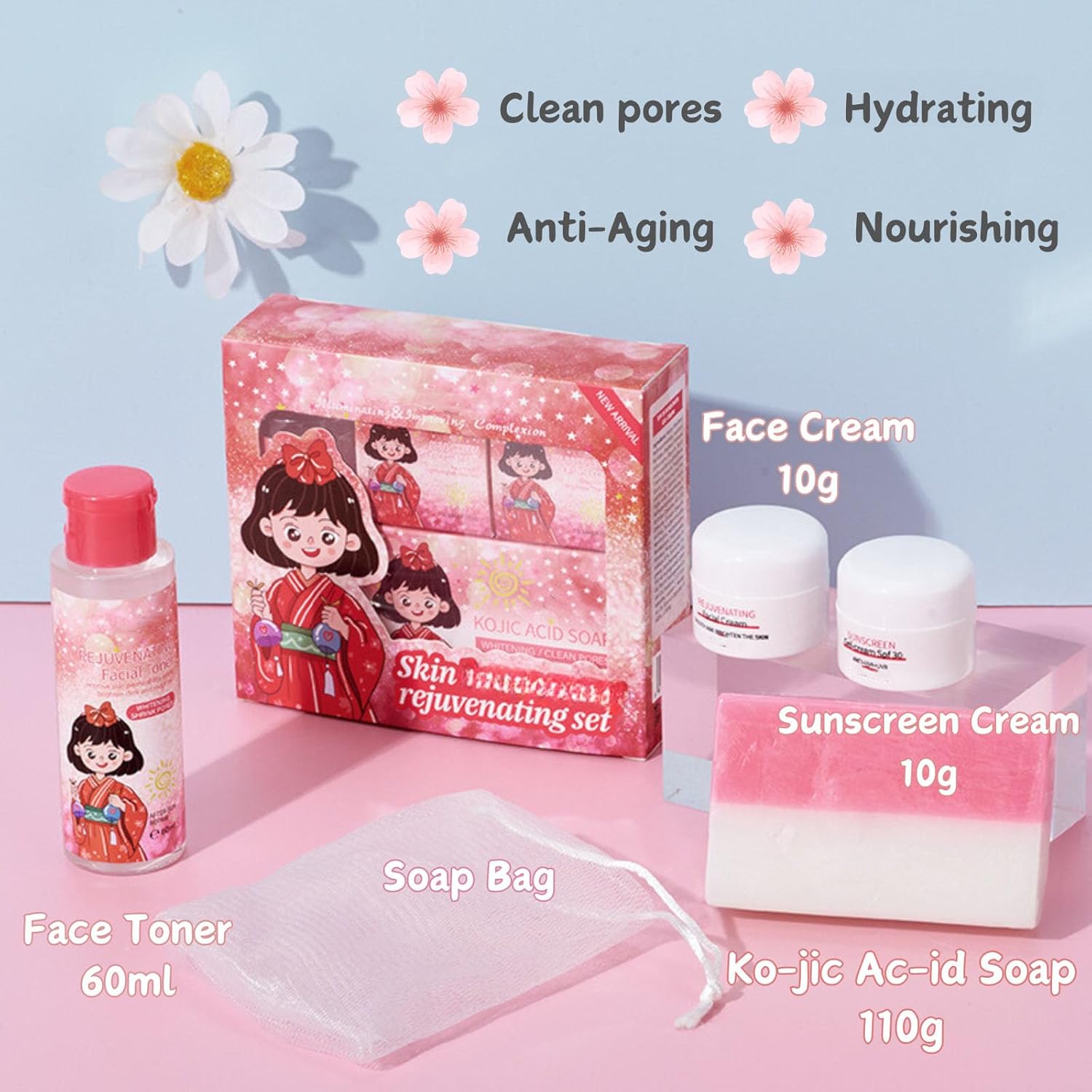 【Complete Skin Care Set】Elevate your skincare routine with our comprehensive women skincare set hydrating, featuring a ko-jic ac-id soap for deep cleansing, a revitalizing face toner to balance your skin’s pH, a nourishing face cream to hydrate and protect, and a spf 30 sunscreen gel-cream to shield your skin from UV rays.