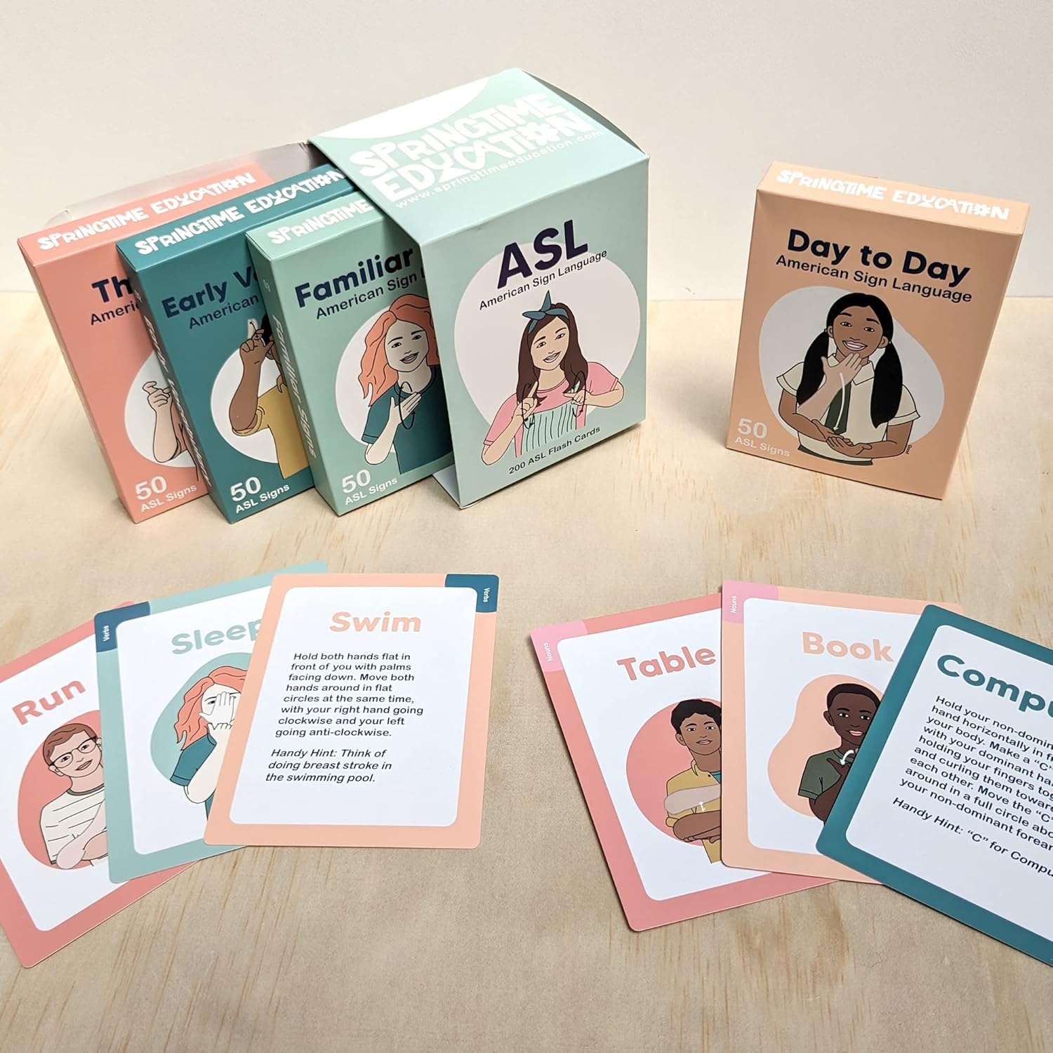 200 AMERICAN SIGN LANGUAGE FLASH CARDS – 4 packs of 50 cards including The Basics, Early Vocabulary, Familiar Signs and Day to Day, covering ABC alphabet, Numbers, People, Animals, Emotions, Seasons, Colors, Greetings and a whole lot more!