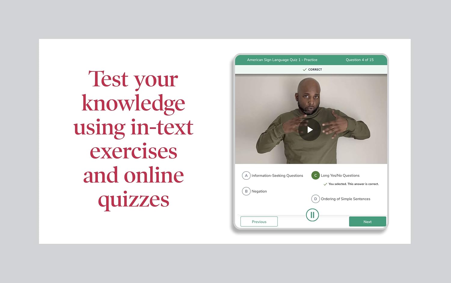 Barron’s American Sign Language is a brand-new title on ASL that can be used in the classroom, as a supplemental text to high school and college courses, or for anyone who wants to learn proper ASL.The only American Sign Language book with comprehensive instruction and online graded video practice quizzes, plus a comprehensive final video exam.Content includes topics on the Deaf culture and community, ASL Grammar, fingerspelling, combining signs to construct detailed sentences, Everyday ASL, and much more.More than 1,000 illustrations of signs with instructions on movement–step-by-step with dialogue, tip boxes, and practice exercises and quizzes throughout to reinforce retention and to track your progress.Essential Grammar: Our in-depth explanations will help you to understand core grammar, sentence structure, and facial grammar.Everyday Phrases: Sign phrases like “hello” or “sorry” that are used in daily conversations.