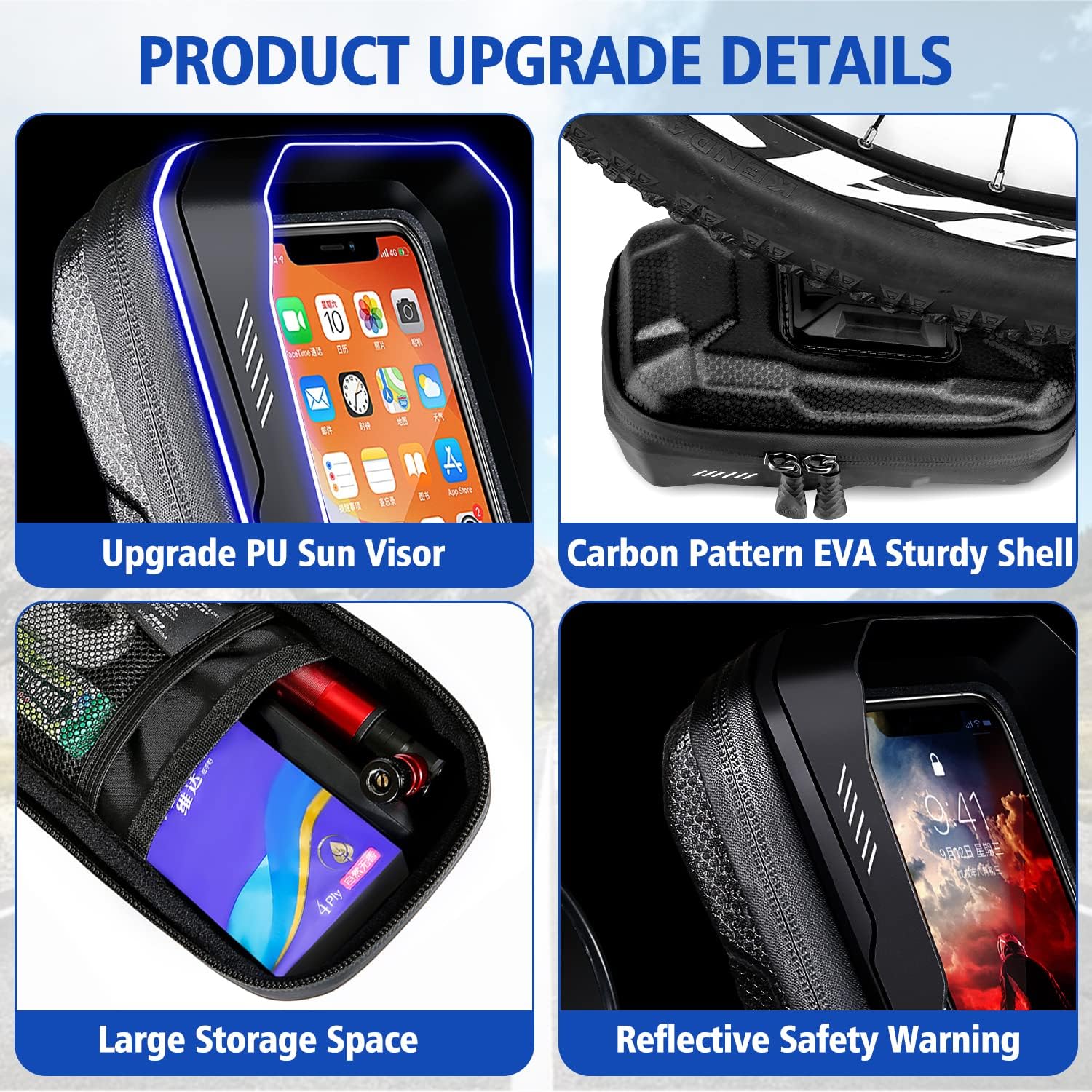Waterproof Design: motorcycle cell phone holder is made of PU+PVC+EVA material and waterproof zipper design, which can prevent water splash, snow, sand, dirt and dust; A waterproof rain cover protect the Motorcycle Phone Holder Mount from rain and UV rays