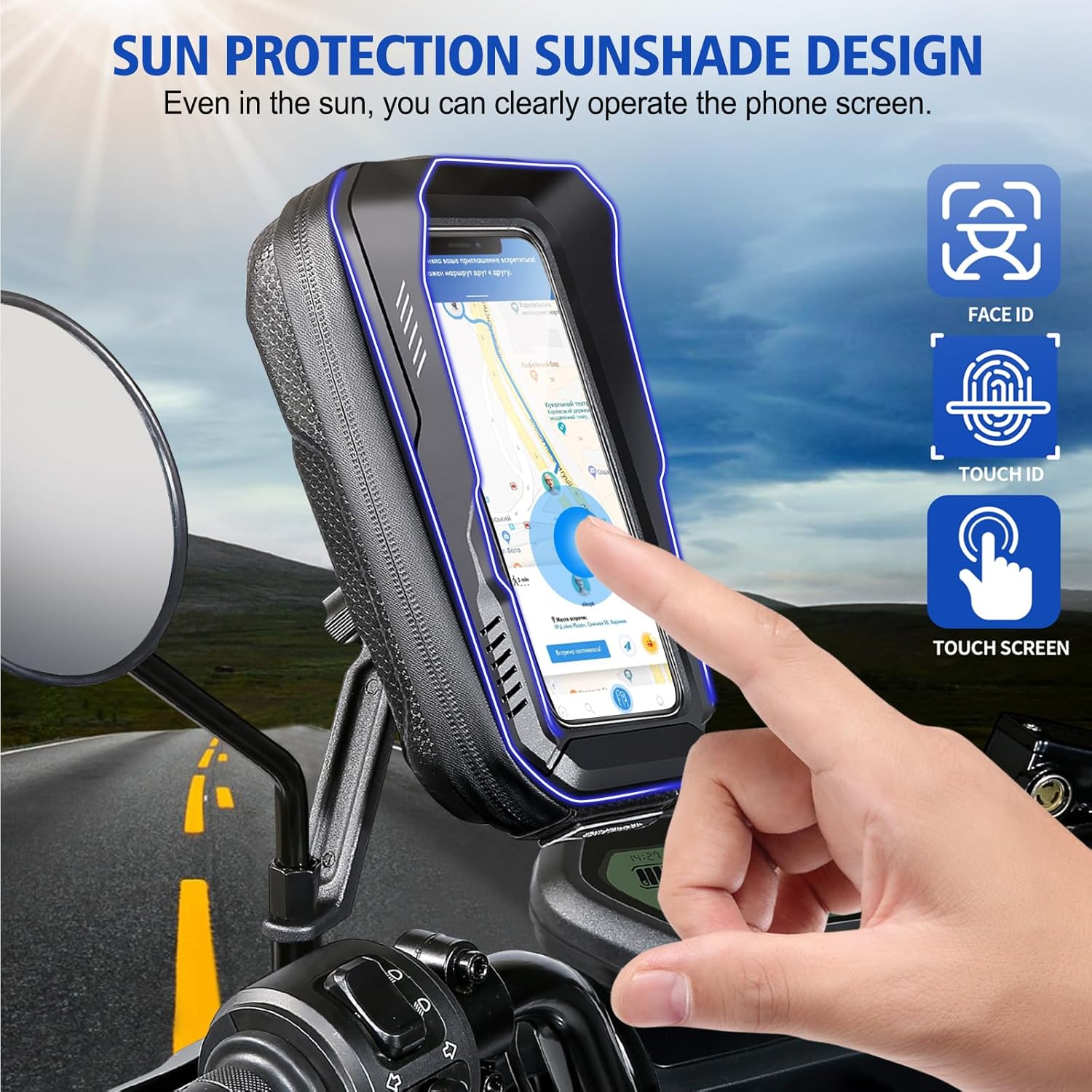 Ultra Sensitive Touch Screen: waterproof motorcycle phone mount screen is made of TPU material with a thickness of 0.3 mm and sensitivity of over 95%; phone holder for motorcycle features face recognition, fingerprint unlock and touch screen recognition