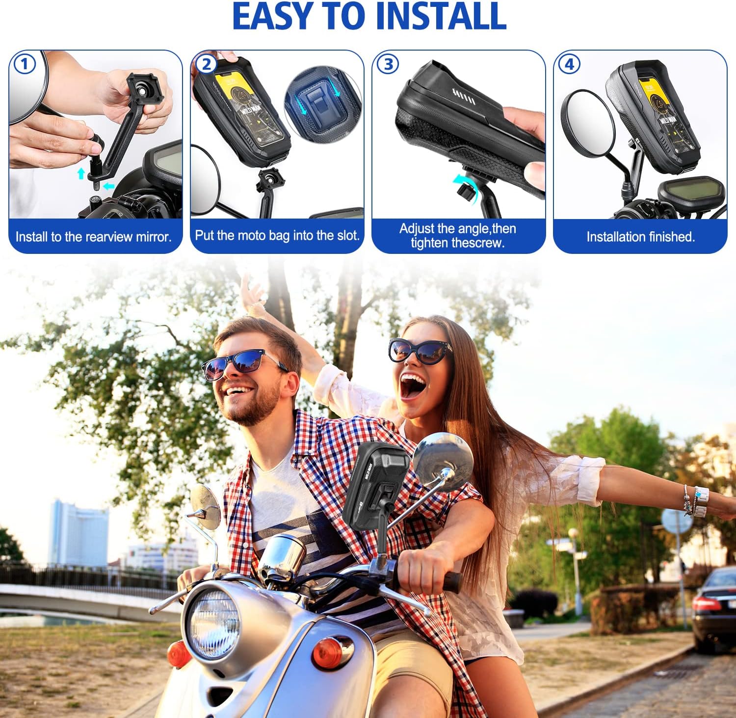 Universal Compatibility: The motorcycle cell phone mounts can hold smartphones and GPS devices up to 6.7 inches. In addition, the scooter phone holder has enough space to store items, you can put cards, cash, power cords, earphones, etc. in the car bag