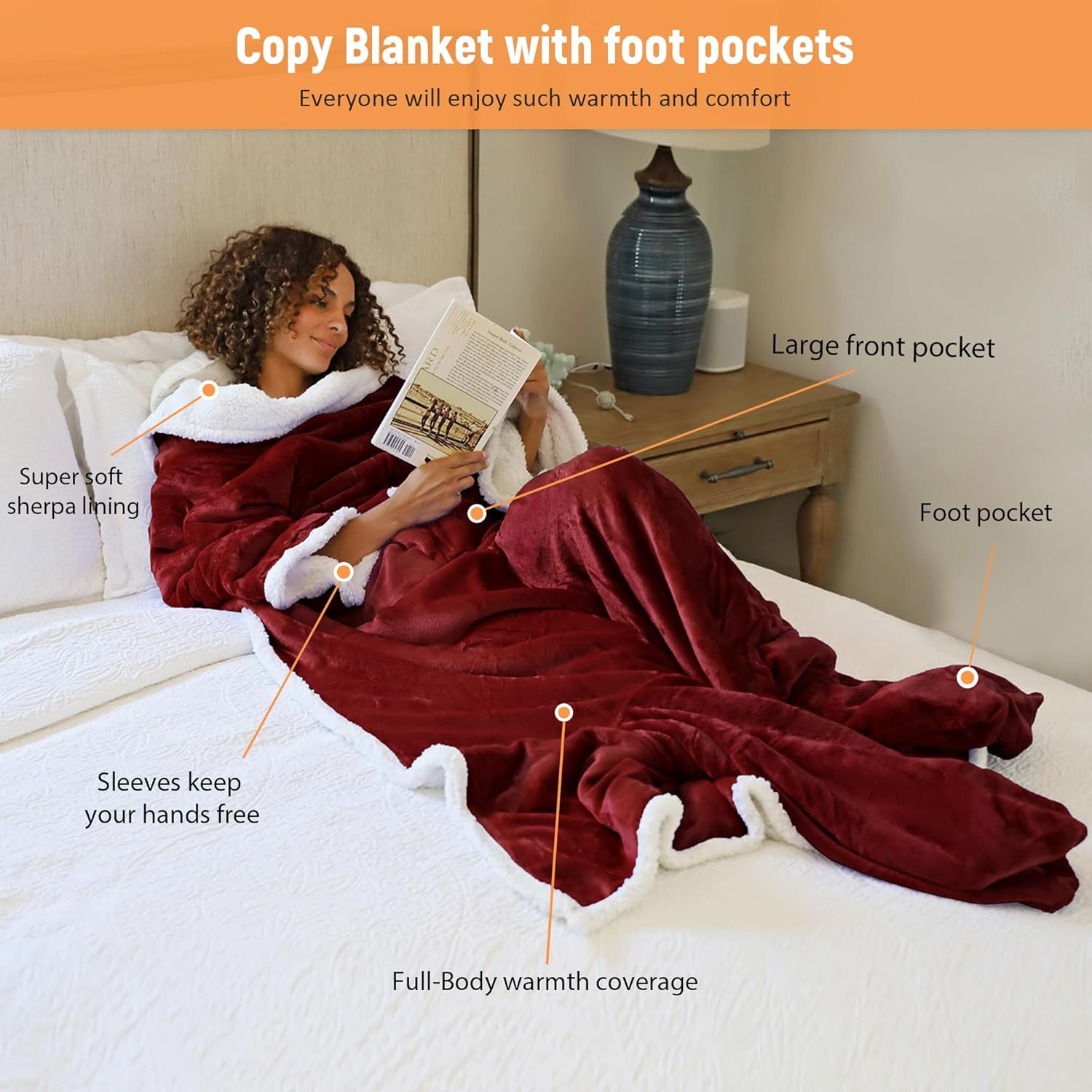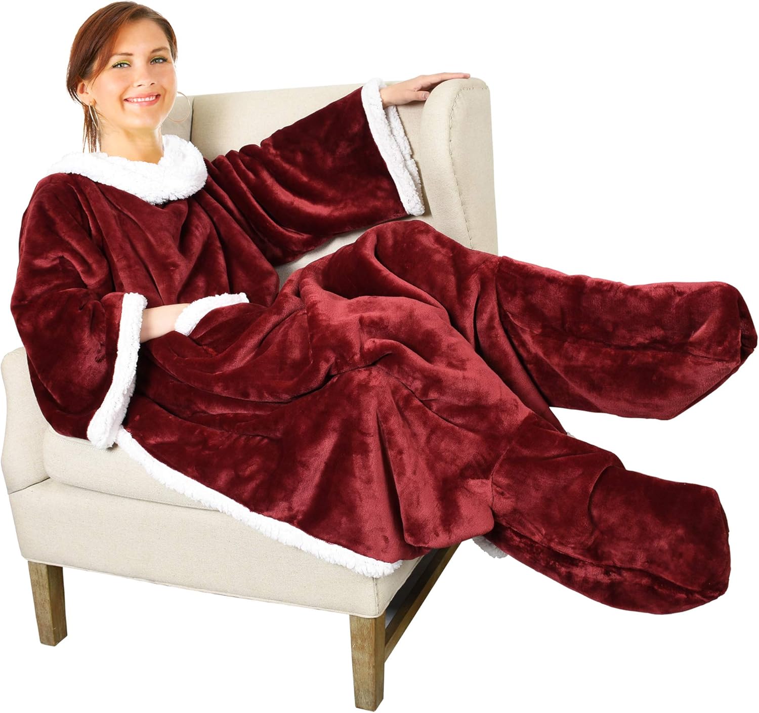 Catalonia Sherpa Wearable Blanket with Sleeves & Foot Pockets for Adult Women Men, Comfy Snuggle Wrap Sleeved Throw Blanket Robe, Gift Idea, Wine