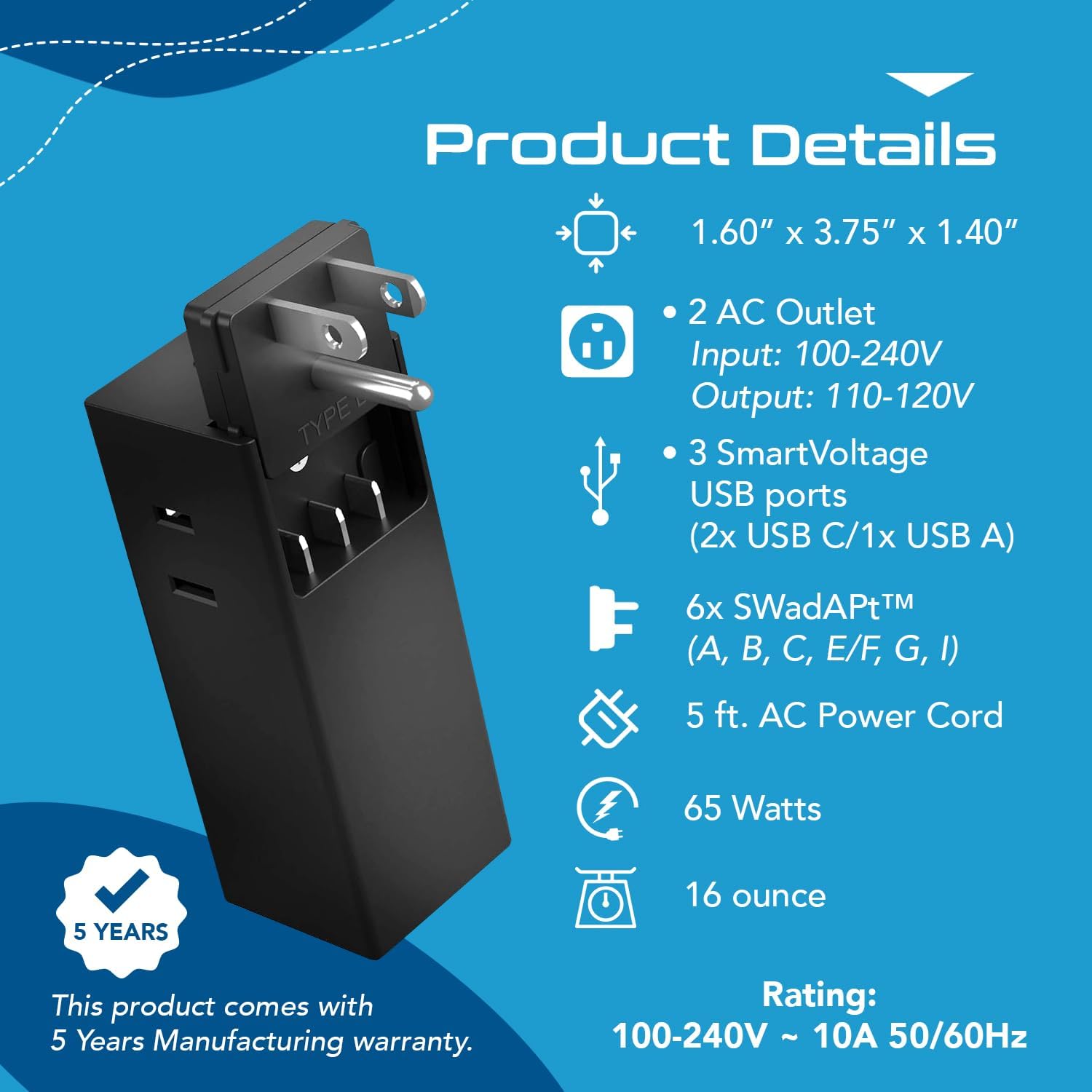 Ceptics 65W World Travel Adapter 3 USB Ports PD 3.0 Ultra Compact Charger 2 US Outlets [GaN Tech], Quick Type C, Charge Laptops, Cellphones in Europe, Asia, Africa, America and More