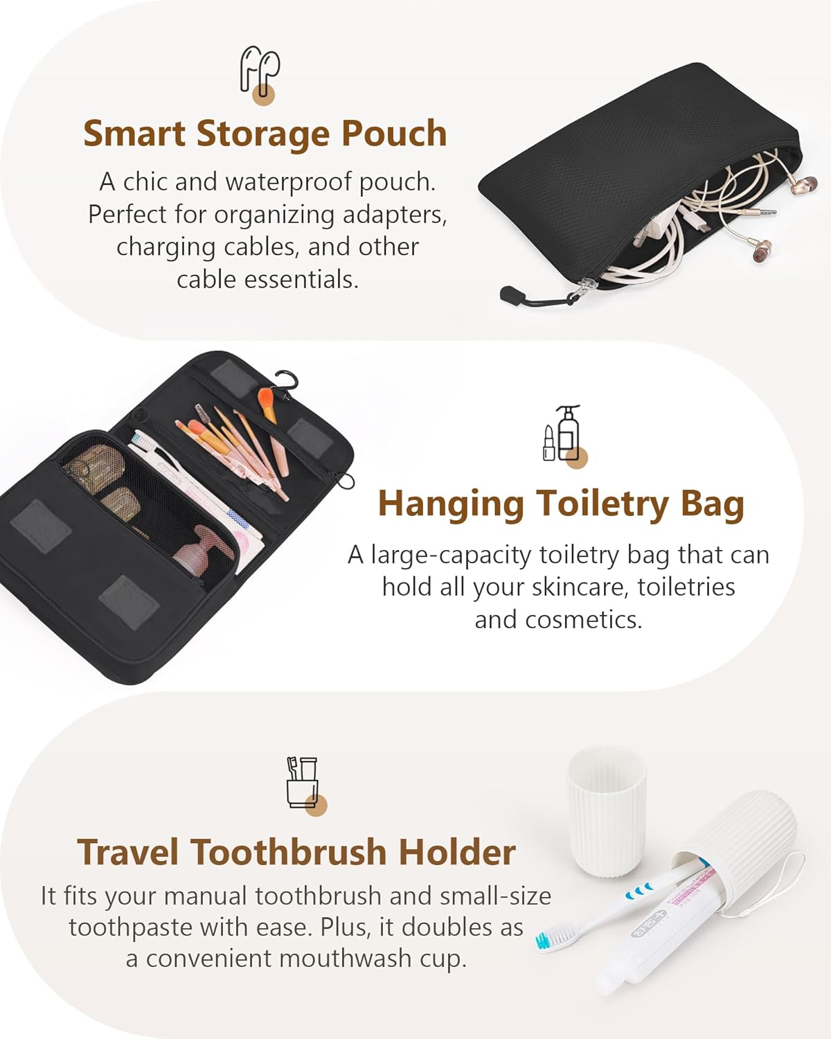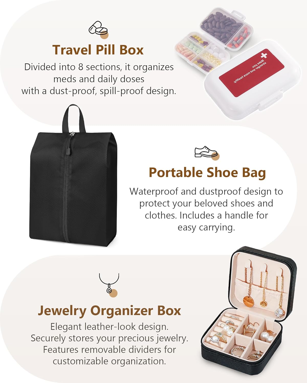 【Compression Packing Organizers 12 Set】Compression Packing Cubes * 5, Laundry Bag * 1, Shoe Bag * 1, Toiletry Bag * 1, Waterproof Pouch * 1, Travel Toothbrush Holder * 1, Jewelry Organizer Box * 1, Pill Box * 1