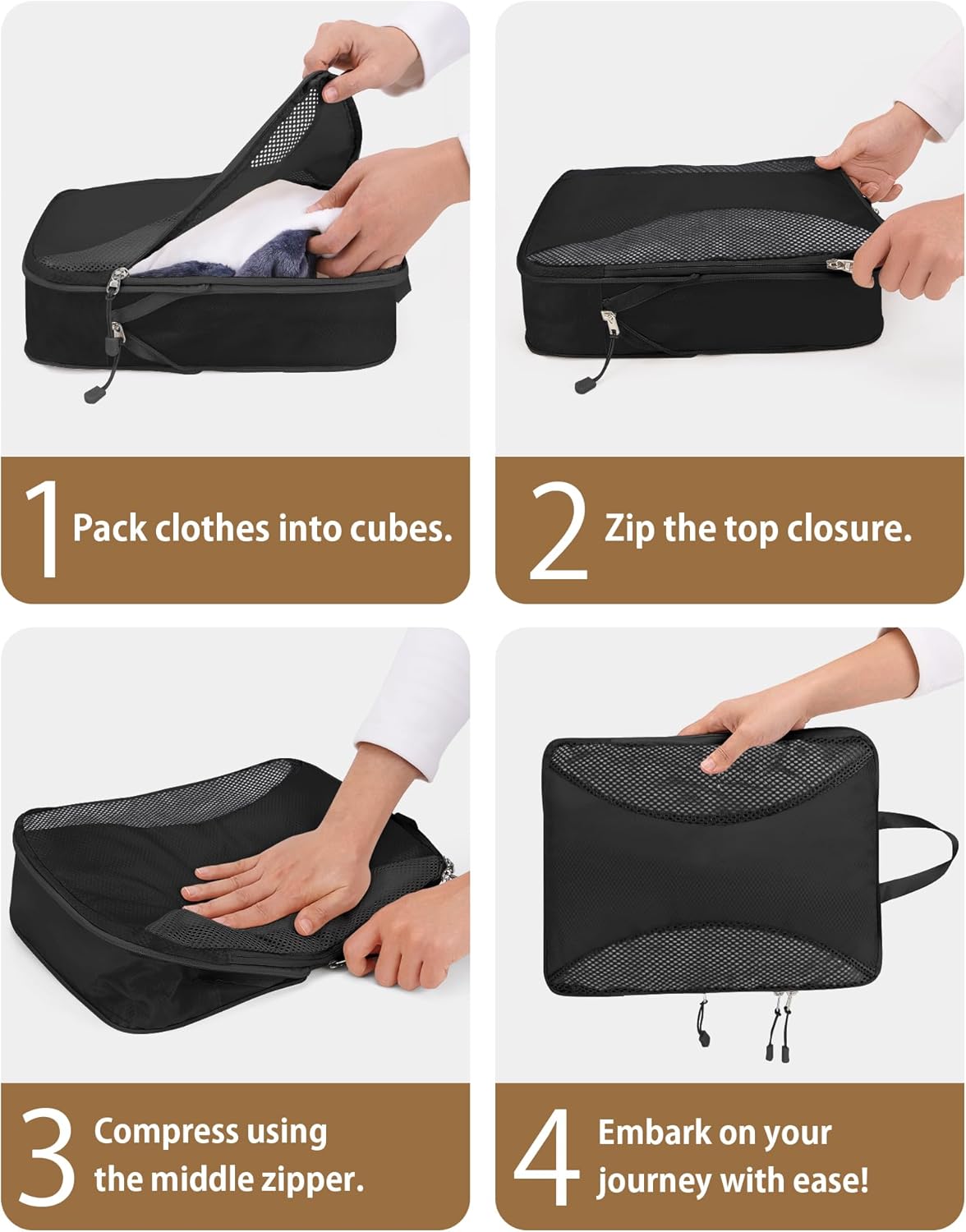 【SAVE 50% OF SPACE】Our Packing Cubes come equipped with an efficient ZIP compression system, saving you both SPACE and TIME when packing. The high compression rate allows 1 suitcase to fulfill the role of 2, and its high efficiency enables you to focus more on your journey.