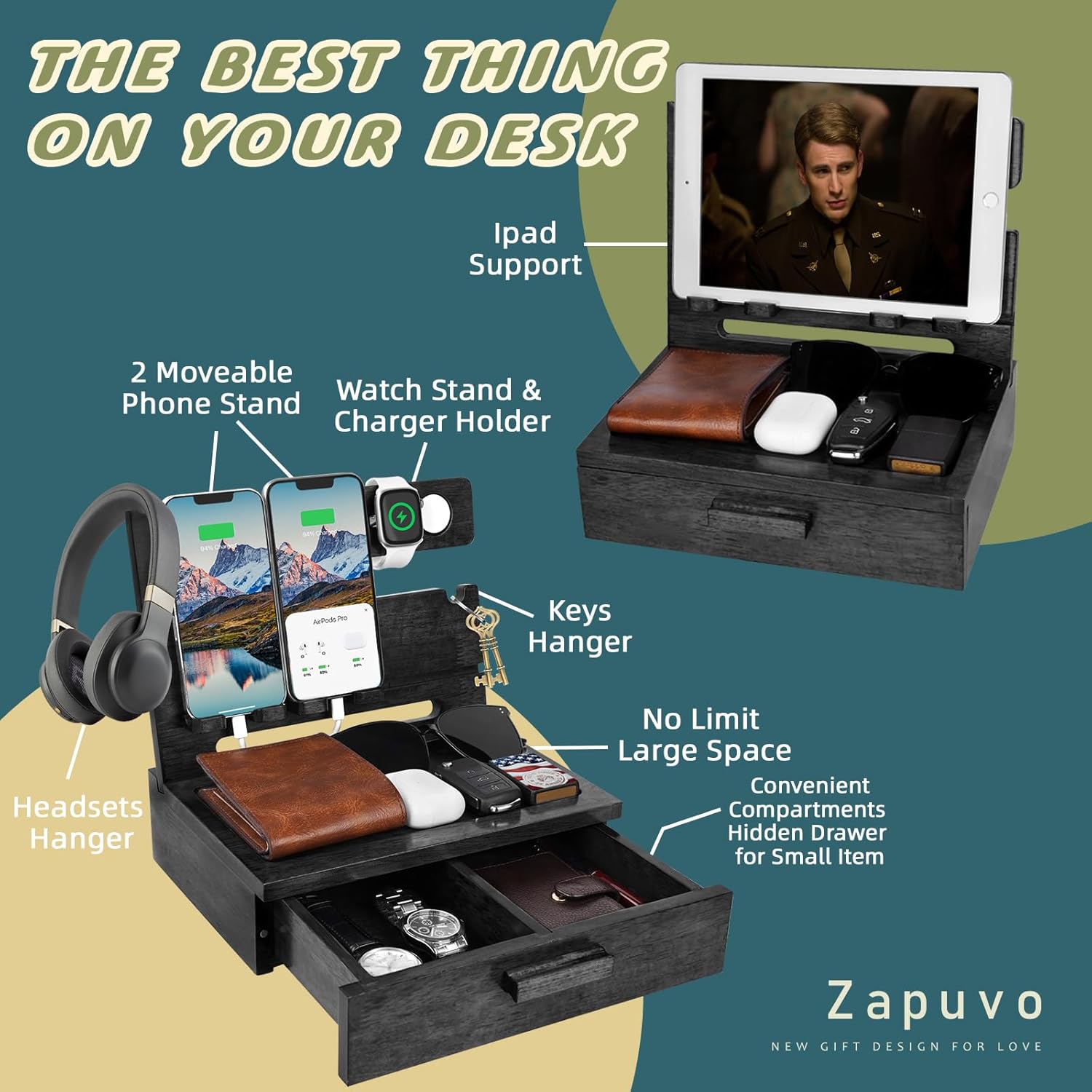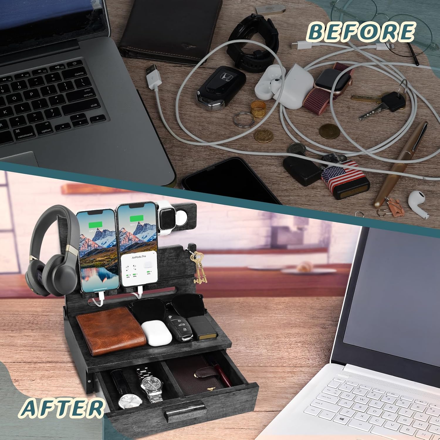 More Convenient Design: Experience ample storage space to conveniently store all your essential items with our wooden docking station. Our phone docking station for men features a hidden drawer with 2 compartments to easily store and organize your small items including coins, rings, keys and anything else you want to keep safe and sound