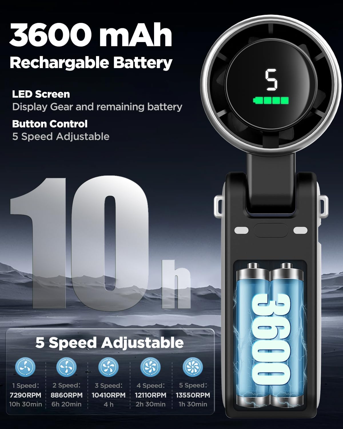 【5-Speed Turbine Powerful Wind Cooling Fan】This Portable Hand Held Turbo Fan has a built-in powerful brushless pure copper motor, upgraded to 5-speed turbine power, with faster rotation speed and stronger wind power. The Handheld Fan 1 gear is 3.8m/s, 7290RPM; the 2 gear is 4.8m/s, 8860RPM; the 3 gear is 6.1m/s, 10410RPM; the 4 gear is 7.5m/s, 12110RPM; the 5 gear is 9m/s, 13350RPM Compared with similar fans on the market, it generates greater air volume and has stronger heat dissipation capabilities.