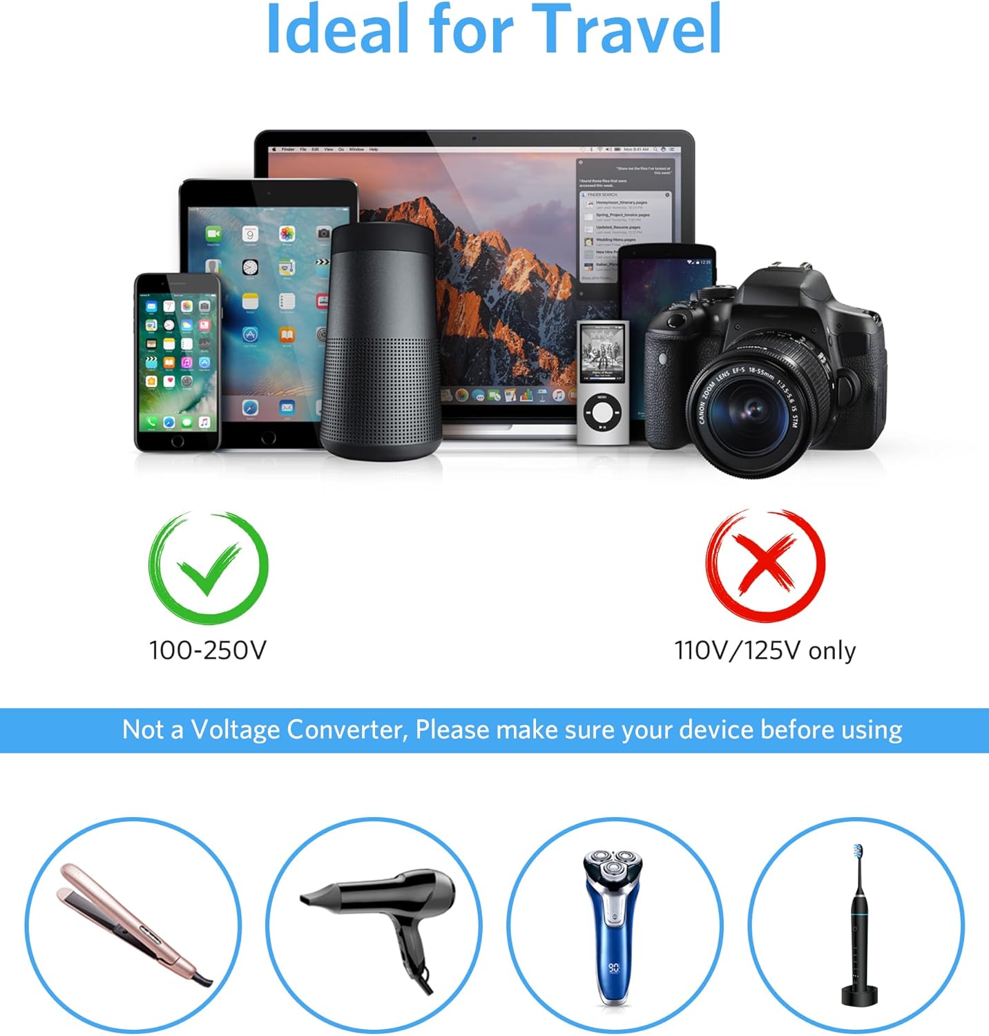 【For High-Power Devices】The Europe USB power strip accepts the standard American 2 or 3-prong flat pin plug. The Input Voltage is AC100-250V 50/60Hz, 16A; 3 USB charges up to 3.0A. Our travel adapter worldwide can be used for high-power electrical devices, such as hair dryers, straighteners, or curling irons. Please make sure these high-power devices are wide-voltage 110-220V, or you may need a power voltage converter.