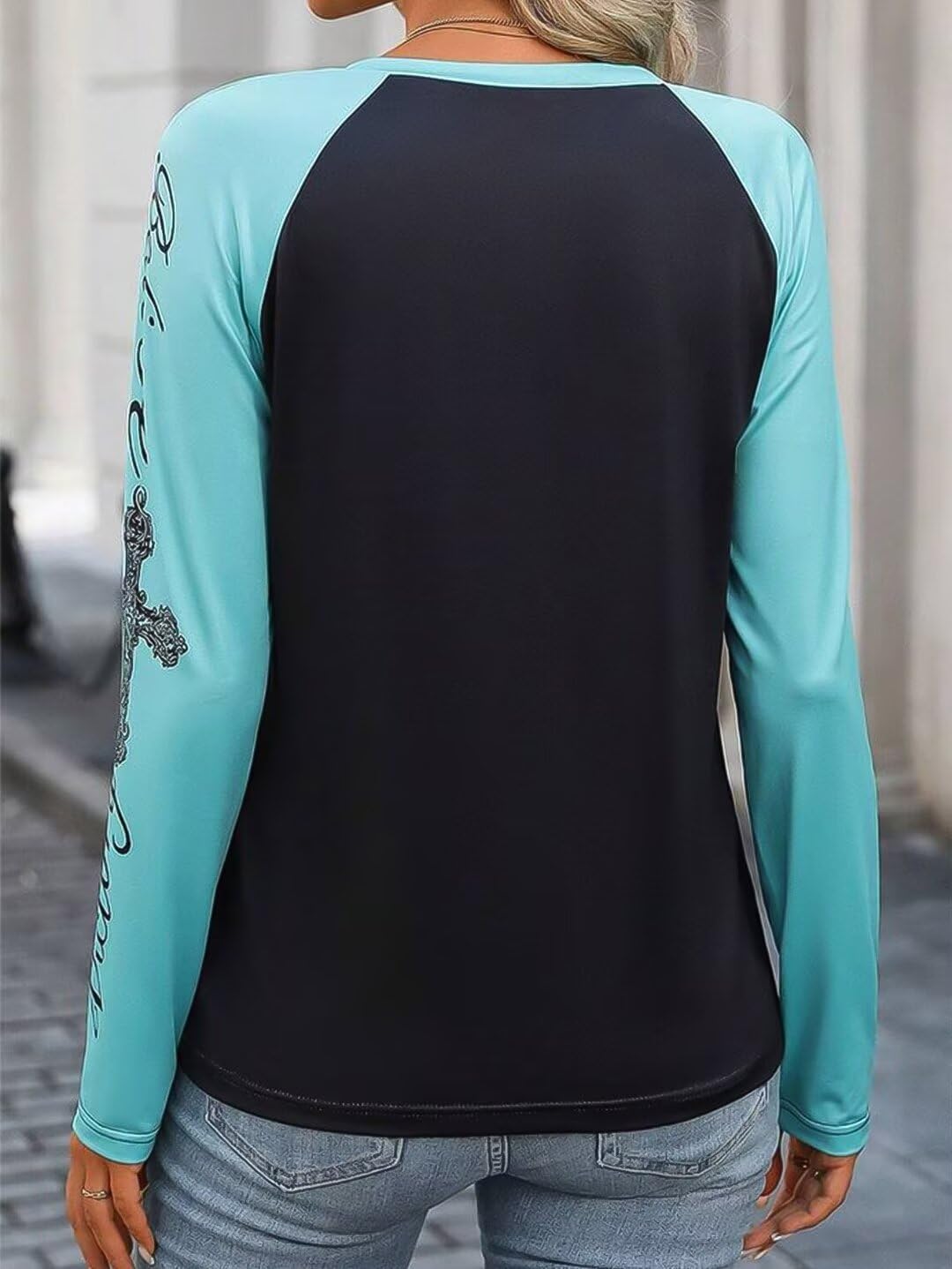Flamingals Casual Long Sleeve V-Neck Colorblock Pullover Blouses Tops