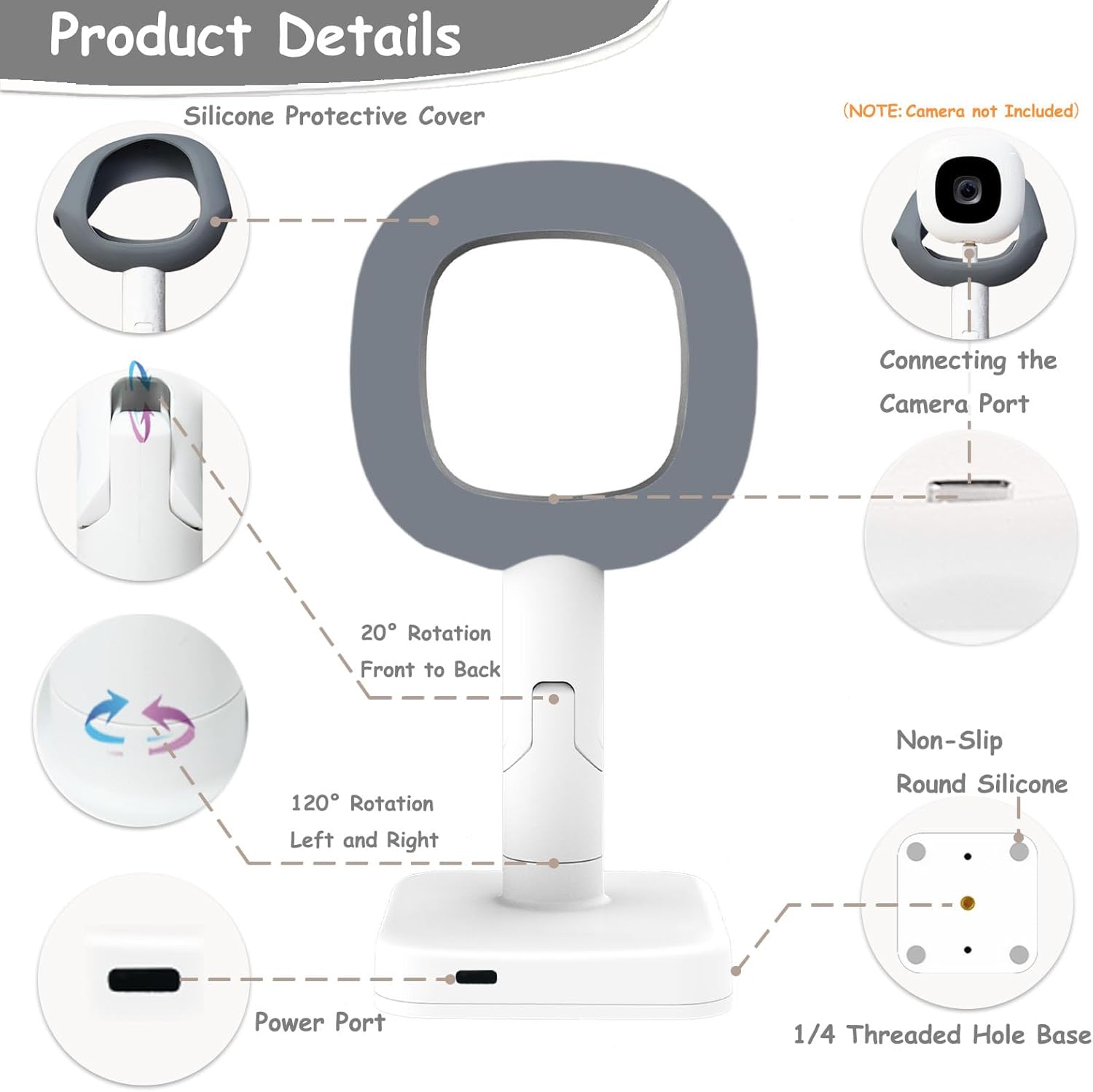 【Flexible and Portable Travel Stand】Whether you’re at home or traveling, simply insert the Pro baby monitor into the flex stand and place it on your desktop. The flexible baby monitor stand rotates 20° forward and backward and 120° left and right, so you can adjust the ideal angle you need for a wider view