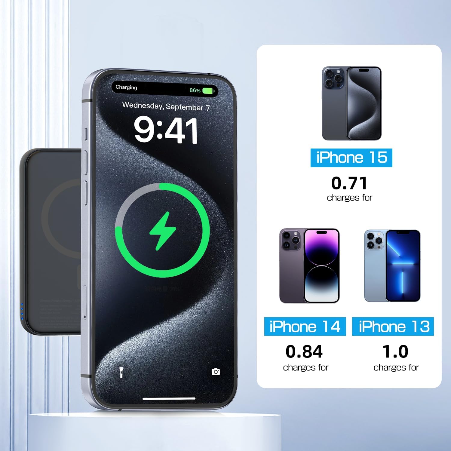 Powerful Magnetic Suction – For magsafe portable charger comes with up to 10N magnetic only for iPhone 16 pro/pro max/plus, iPhone 15 pro/pro max/plus, iPhone 14 pro/pro max, and iPhone 13 pro/pro max/mini, which can easily and stably attach to your phone so that you don’t have to worry about being disturbed while you’re gaming/talking/taking photos with your cellphone due to charging
