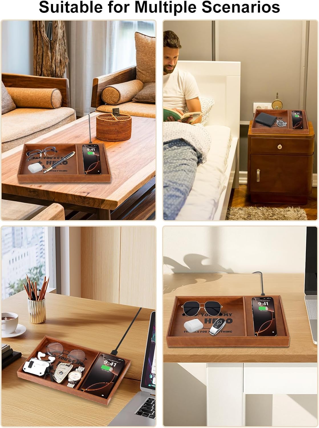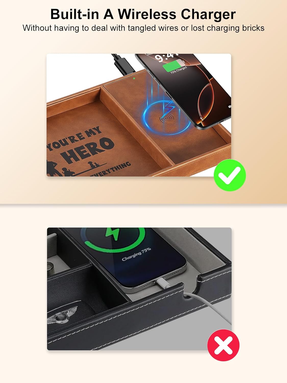 Gifts for Dad Valet Tray, Built-in Wireless Charger, Everyday Carry Tray, Unique Christmas Birthday Gifts for Dad from Daughter Son, Men Gift for Father, New Dad Gifts for Husband from Wife, Brown