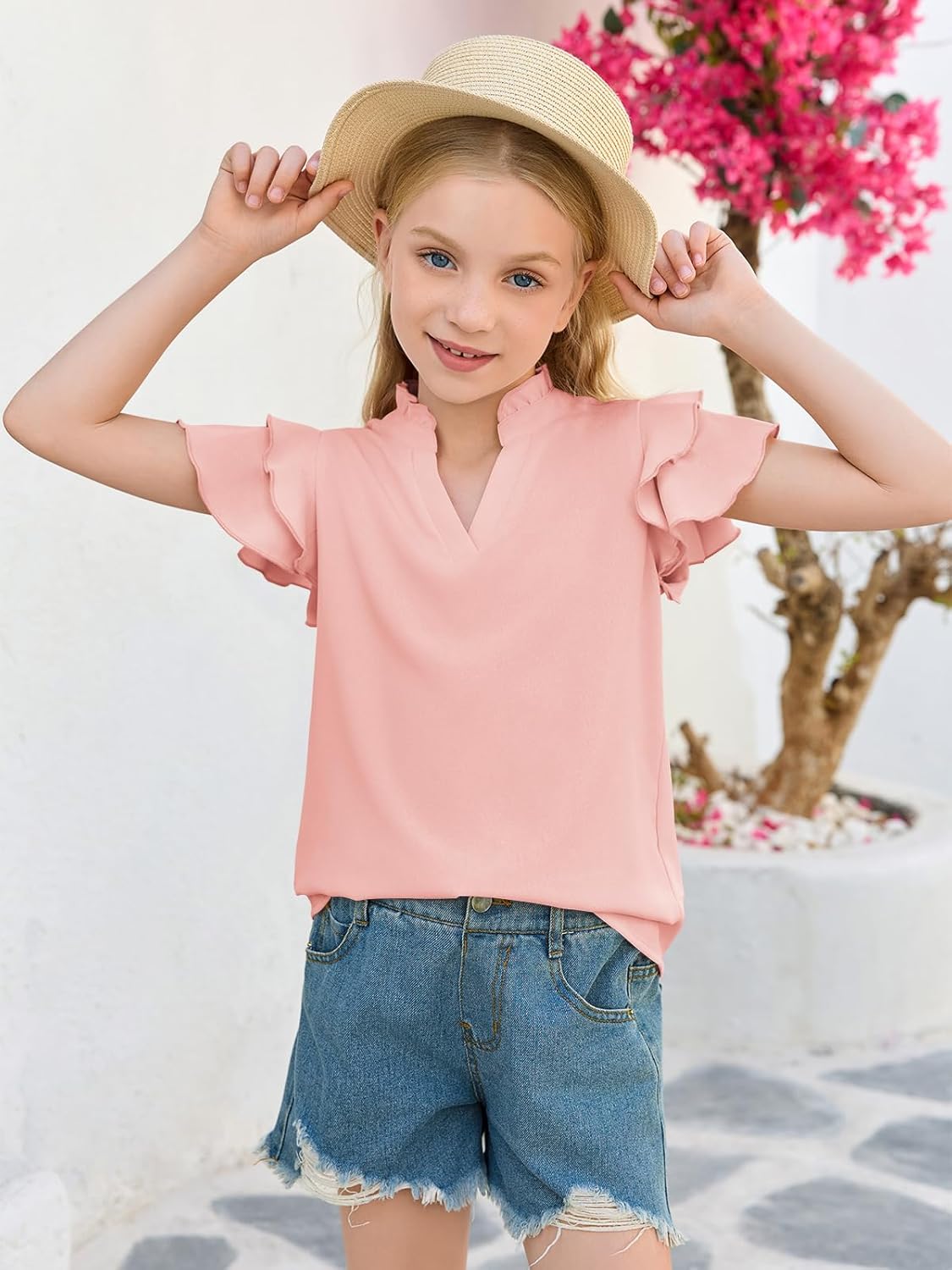 Haloumoning Girls Ruffle Short Sleeve T Shirts Kids Summer Cute V Neck Tops Blouses 5-14 Years