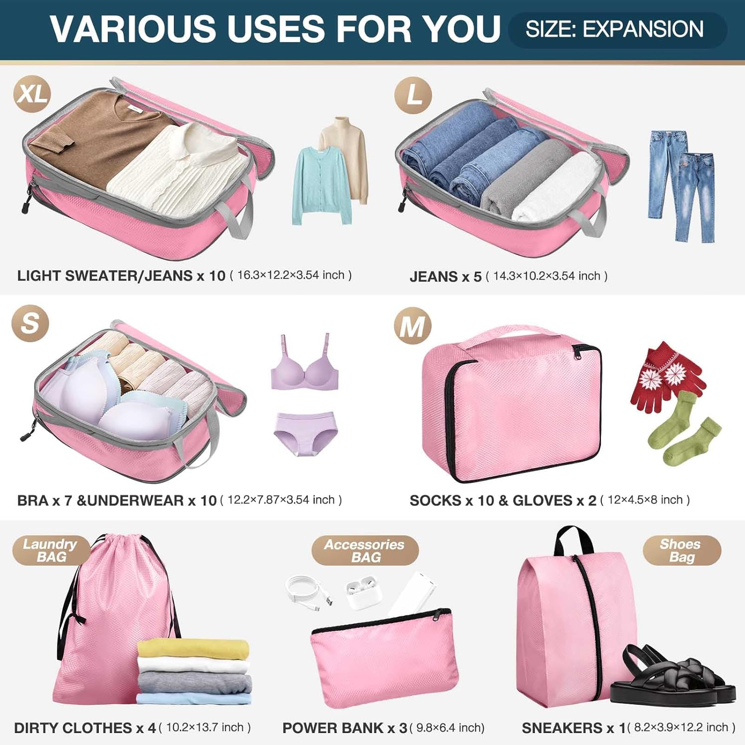 Hommtina Compression Packing Cubes for Suitcases, 7 Set Travel Organizer Cubes for Women (Light powder)
