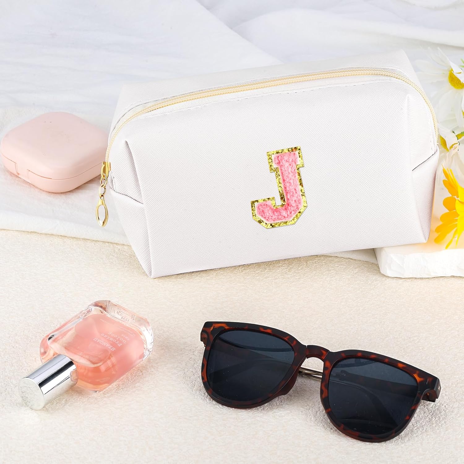 Initial Makeup Bag Personalized Preppy Travel Small Cosmetic Bag Cute PU White Chenille Letter Makeup Pouch for Purse Waterproof Zippered Toiletry Organizer for Women Girls Kids Friends (J)