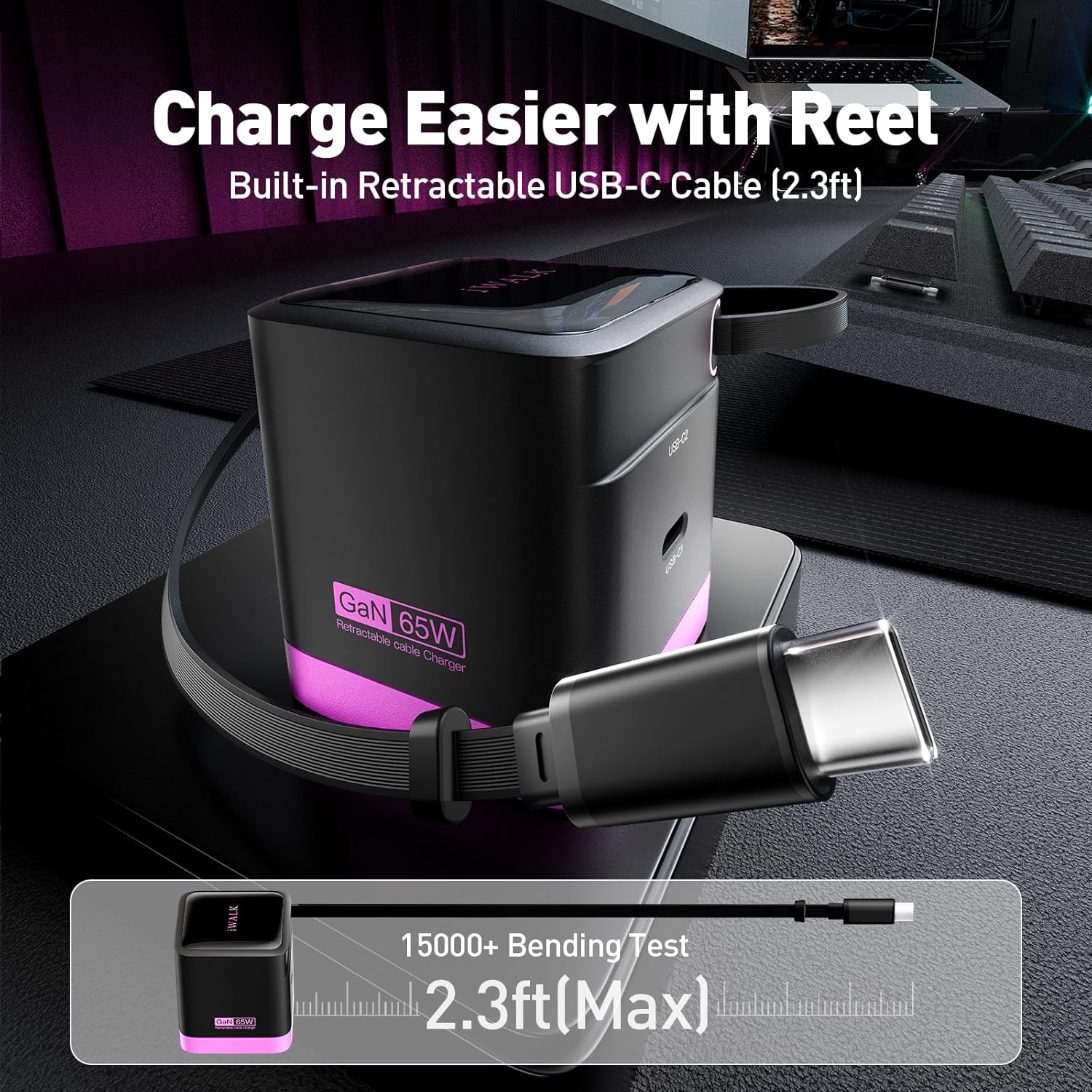 Charge Easier With Reel : Reel Charger offers an extended reach for enhanced flexibility. Pull the durable cable up to 27.56 inches (70 cm) for convenient use across desks, beds, or airport seats. It retracts smoothly when not in use, preventing pet chewing and ensuring safety.