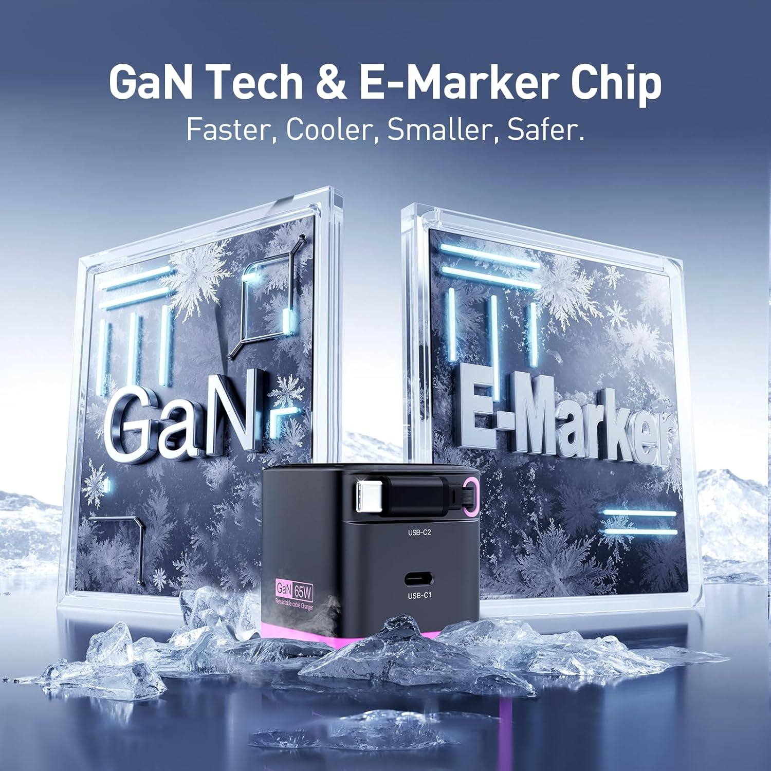 iWALK 65W GaN Charger with Built-in Retractable USB-C Cable, 2 Devices Mini Travel Fast Charging Foldable Wall Charger for MacBook Pro, iPad Pro, Airpods, iPhone 16/15 Pro Max, Galaxy S25/S24 And More