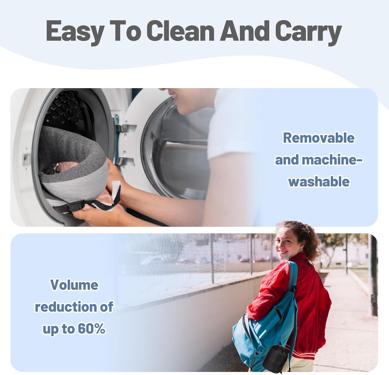 100% PURE MEMORY FOAM PILLOW – The travel pillow is filled with high-density memory foam, and the 5-second rebound technology perfectly fits the curve of your neck. Wrap the travel pillow comfortably around your neck and feel your head and jaw supported, gradually relieving painful pressure points for the ultimate relaxation experience.