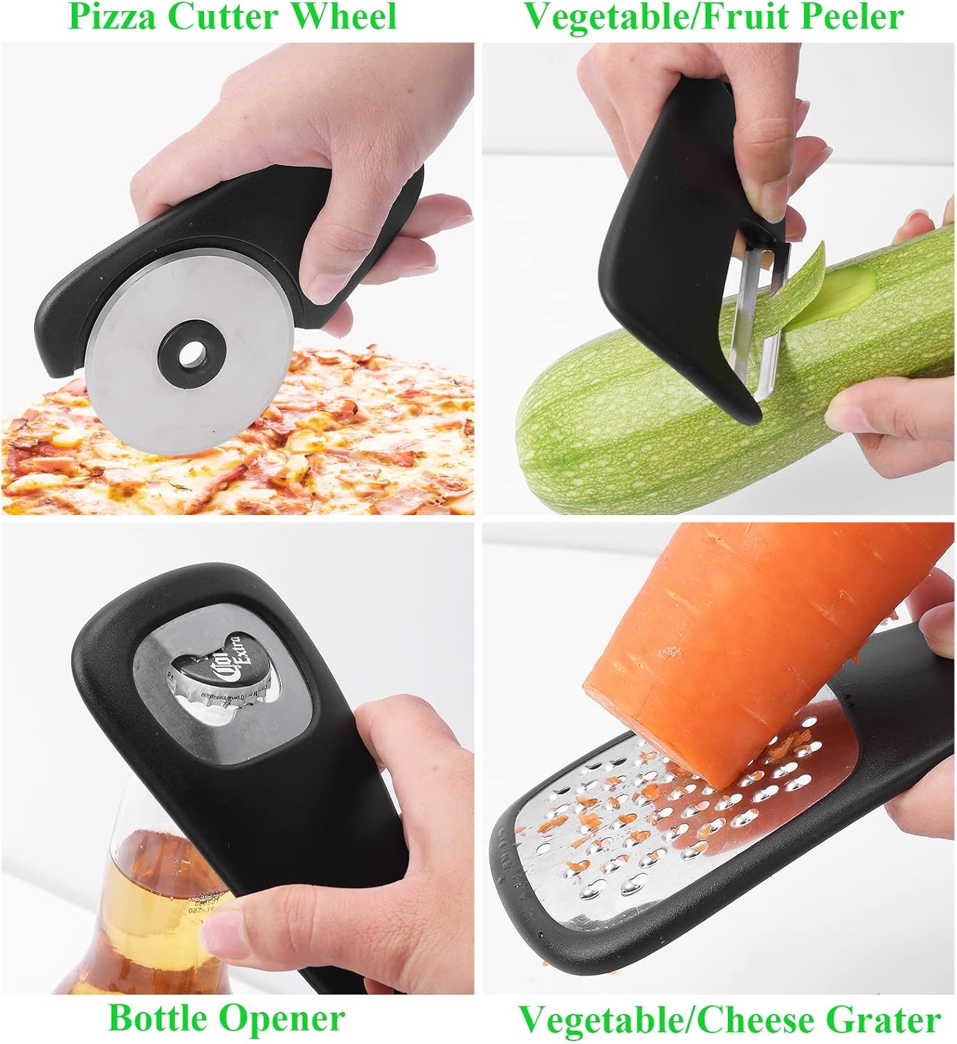INNOVATIVE DESIGN – The kitchen gadgets set is great addition to the kitchen. It covers all the essentials you need – grater, grinder, herb stripper, peeler, pizza cutter, and bottle opener.
