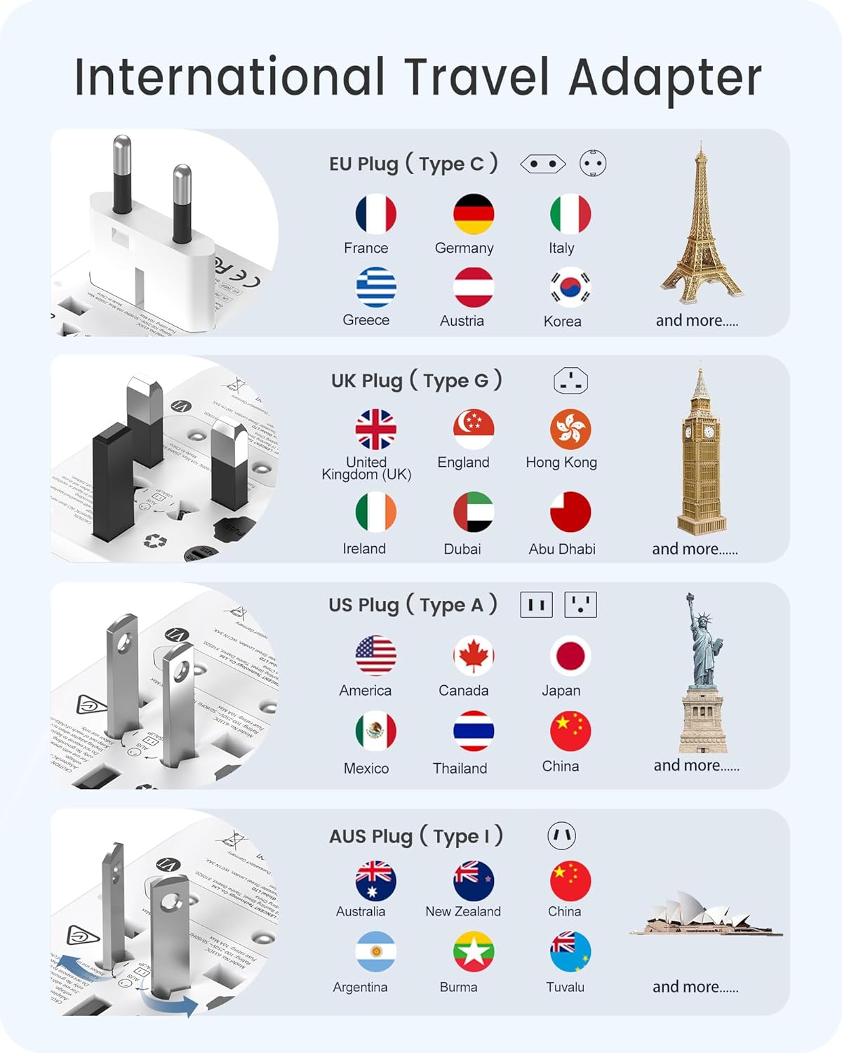 【NOTE】The adapter is not a voltage converter. It cannot convert voltage. Before using this product, please make sure the device will work with the voltage of the place you are going to, especially for hair dryers, electric shavers, hair straighteners and other high power devices.