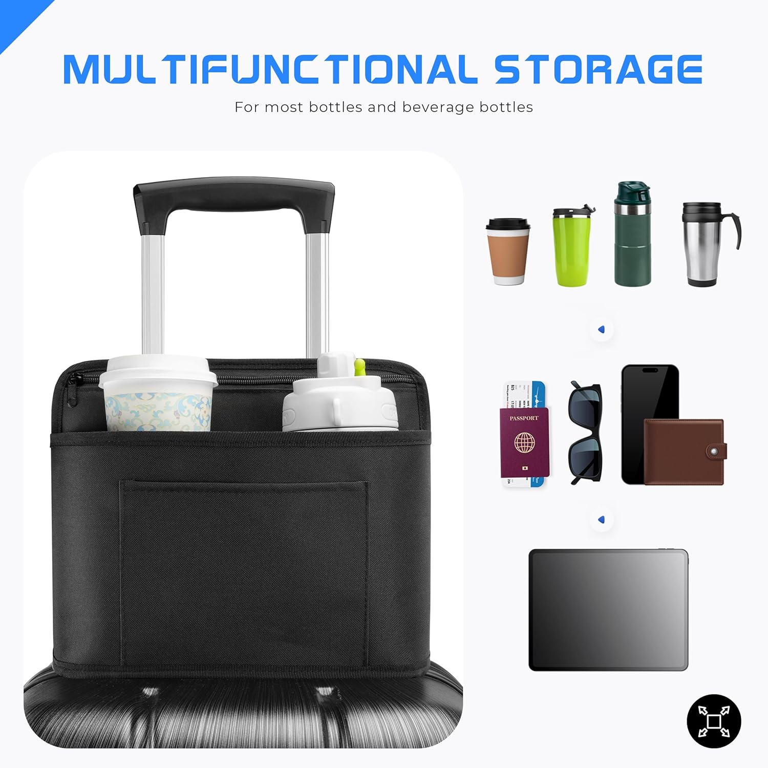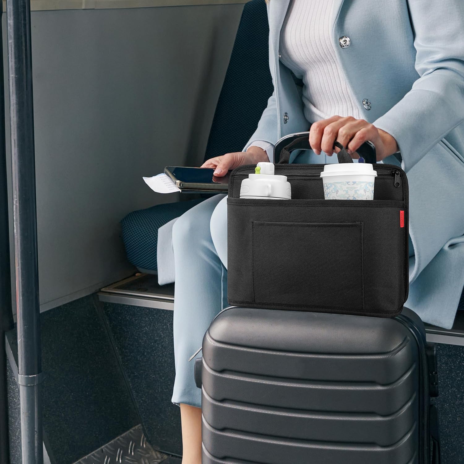 Luggage Cup Holder for Suitcases – Insulated Travel Drink Holder with Storage Pocket, Tablet Compartment, and Handle – Perfect Travel Gift for Travelers, Flight Attendants, and Travel Agents