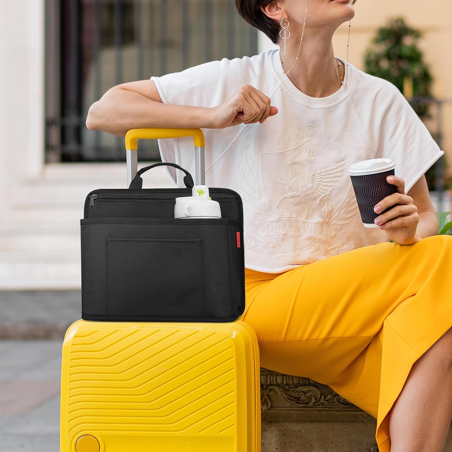 Luggage Cup Holder for Suitcases – Insulated Travel Drink Holder with Storage Pocket, Tablet Compartment, and Handle – Perfect Travel Gift for Travelers, Flight Attendants, and Travel Agents