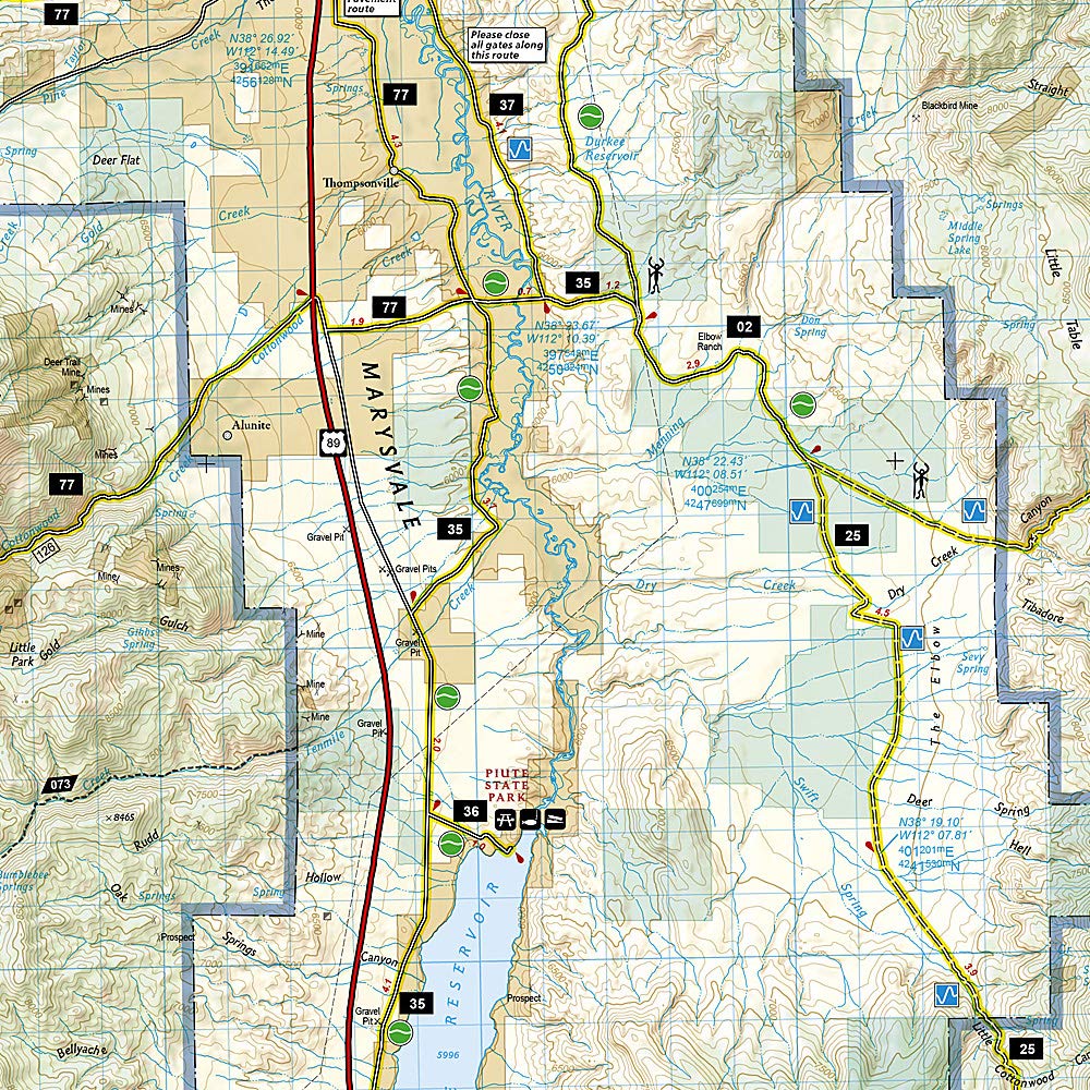 In addition to the Paiute ATV Trail, the map includes portions of the Great Western Trail and the Fillmore, Marysvale, and Richfield ATV loops. Trails are clearly marked according to difficulty and with mileage between intersections to help you plan your excursions. The print version of the map includes over a dozen town access maps that include the services available in each town. The map base includes contour lines and elevations for summits, passes and lakes. Many recreation features are noted as well, including campgrounds, trailheads, interpretive trails, boat launches, and fishing areas.