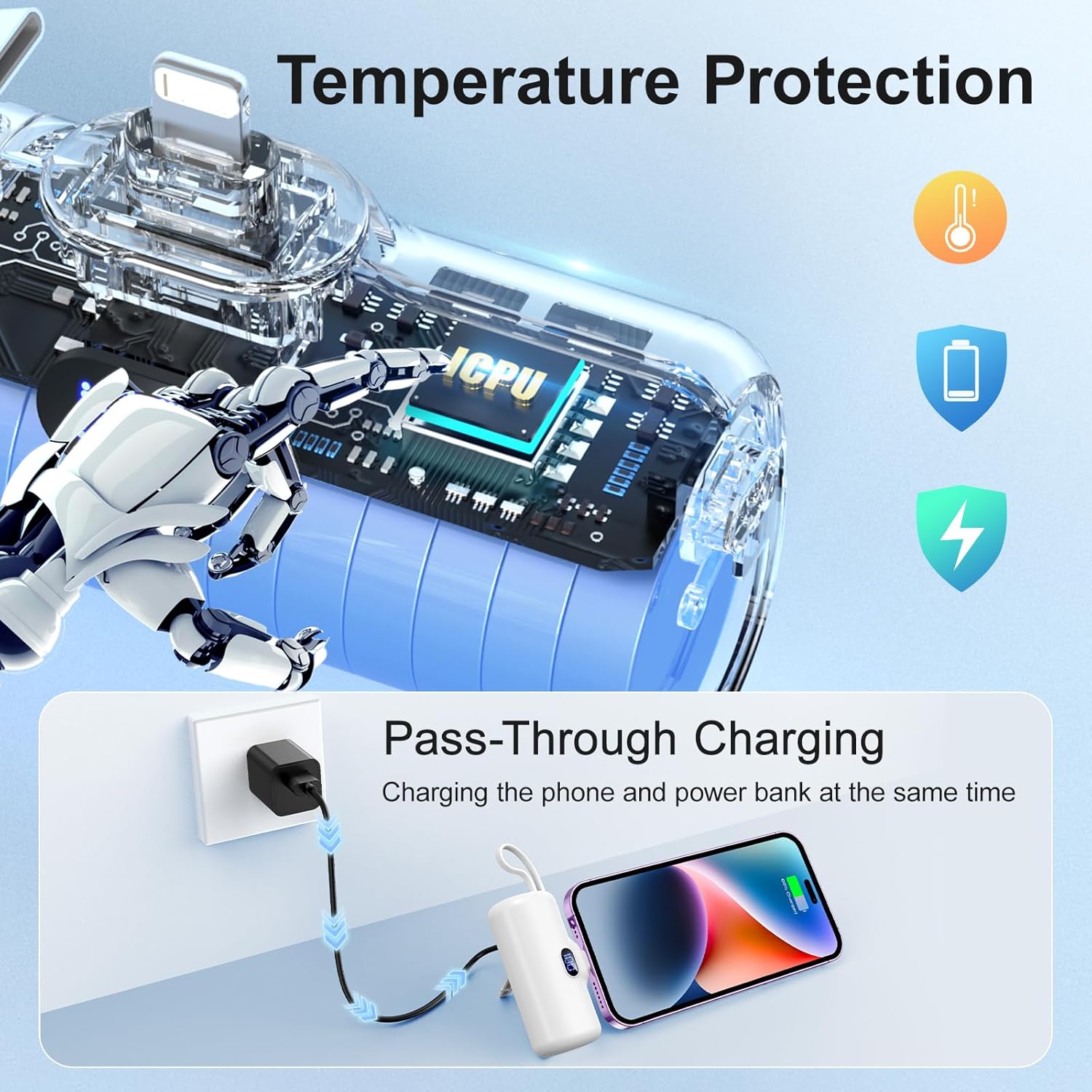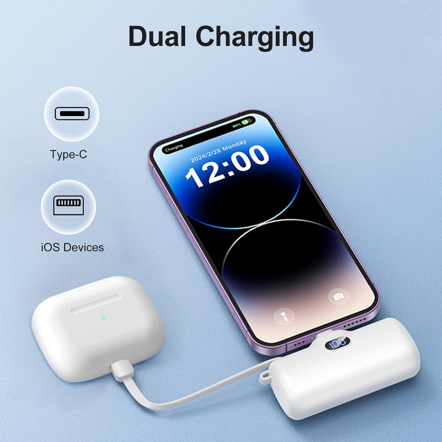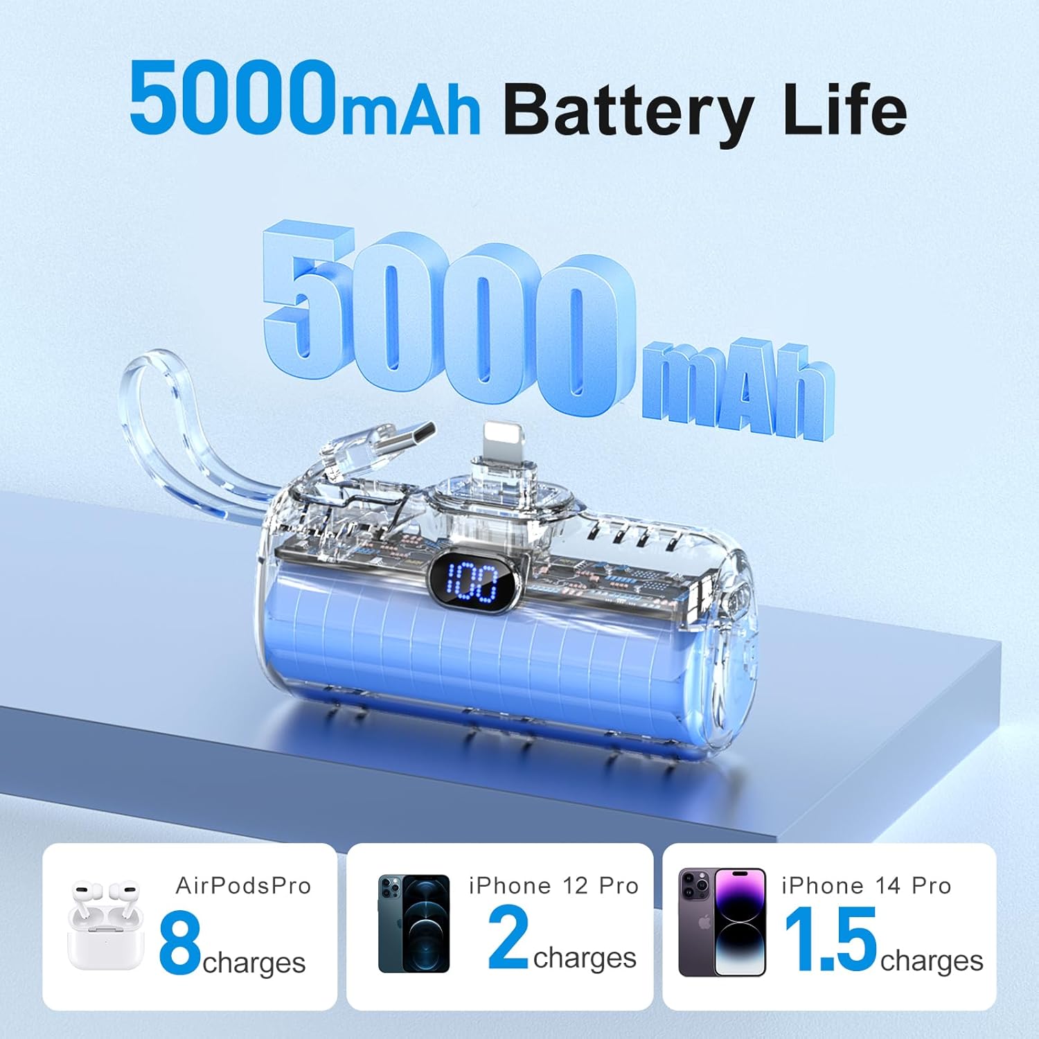 Portable Charger, Mini Power Bank, 5000mAh Phone Charger, Compact Battery Pack for iPhone & Android, USB C Cable, LCD Display, Battery Bank Compatible for iPhone 14/13/12/11/XS/X/8/7/6/5
