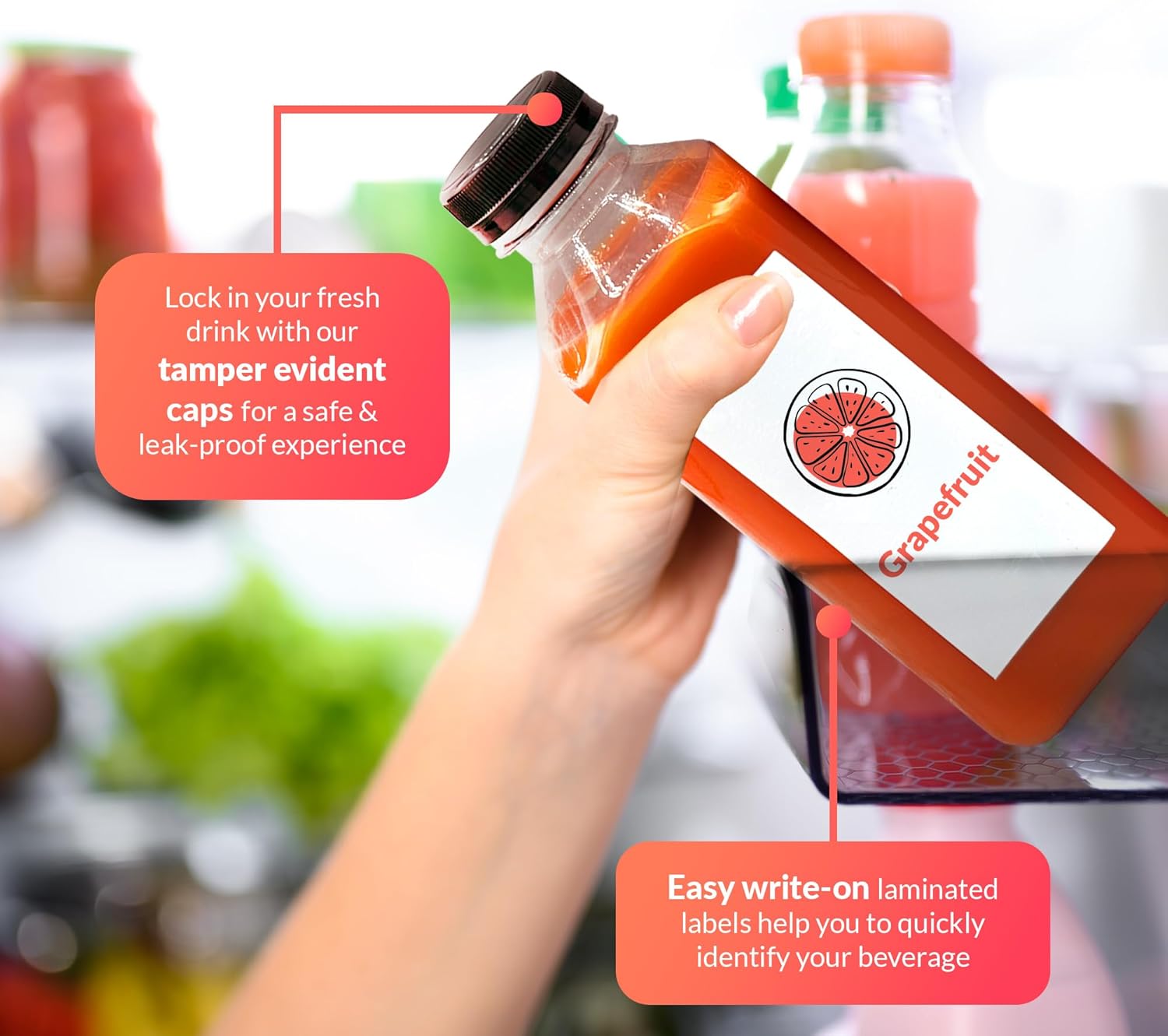 Freshness Sealed: Each black tamper evident cap provides security to ensure there’s no tampering of your drink, remains leak-proof, & locks in your juice or smoothies flavor
