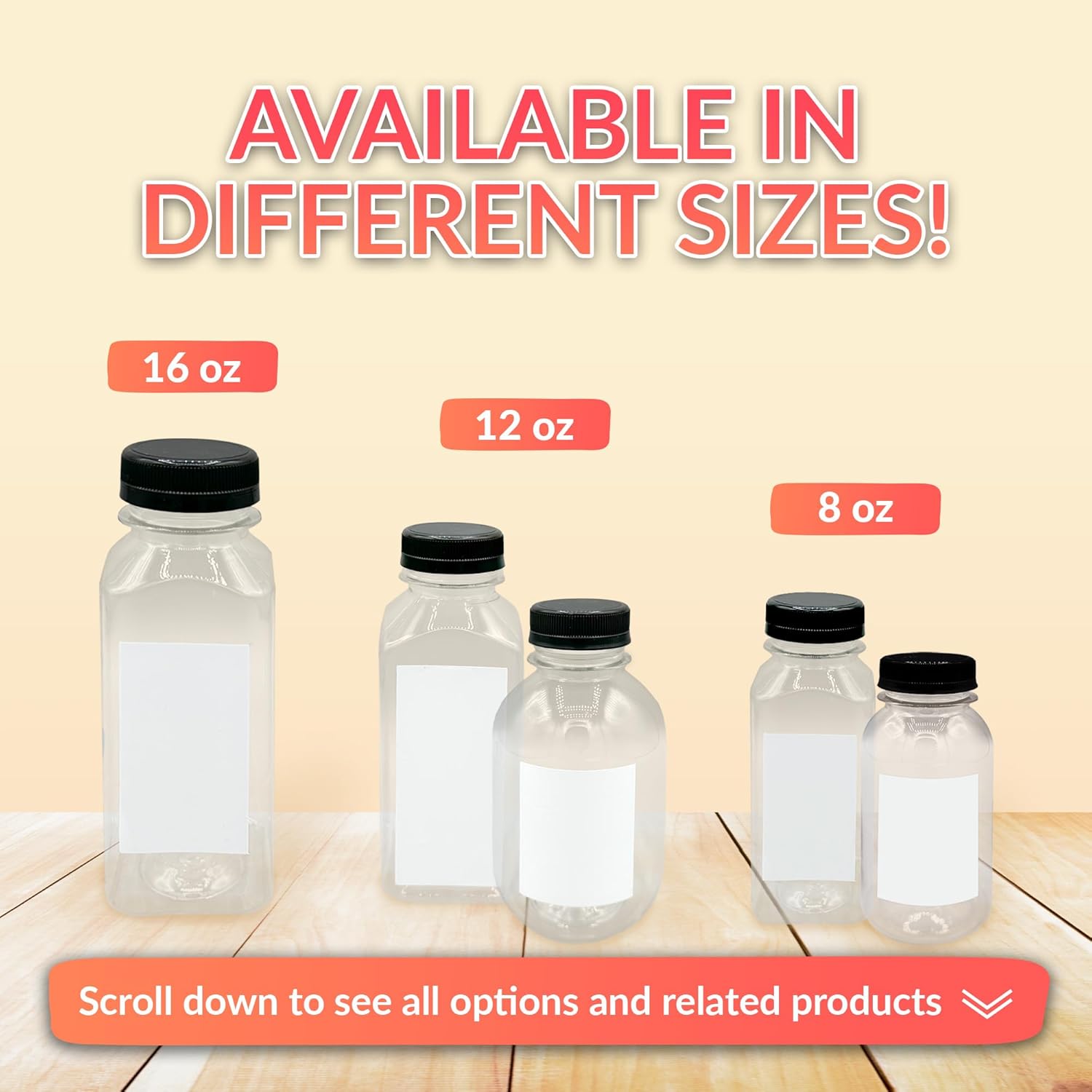 Plastic Juice Bottles with Caps & Sticker Labels | 12 Pack (12 Bottles & 12 Labels) | 16oz – Square | Ideal for Juicing, Smoothies