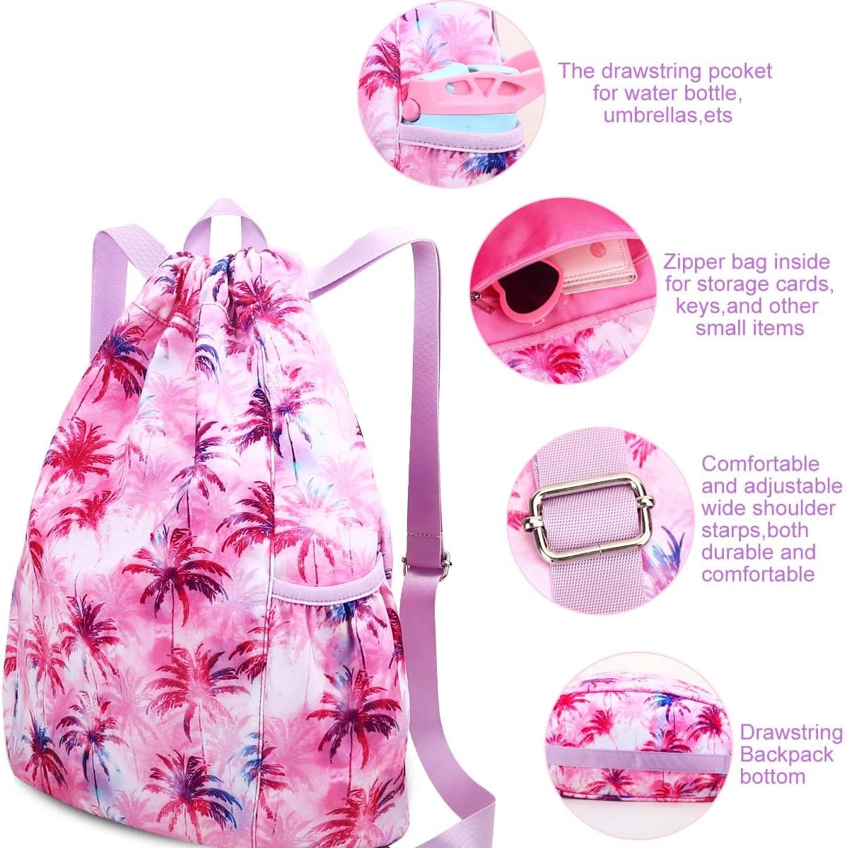 LARGE CAPACITY — The drawstring bag great for packing snorkeling gear, beach items, swim training equipmentand summer camp supplies.two sides bags allow you to place a water bottle, umbrella easily. Inside of string bag pack, the zipper pocket can hold small valuables such as wallet, cellphone, keys to prevent loss. Multiple Pockets help you to keep things to be placed by category.(Please refer to the main picture for the capacity and size, Basketball and soccer balls cannot be accommodated.)