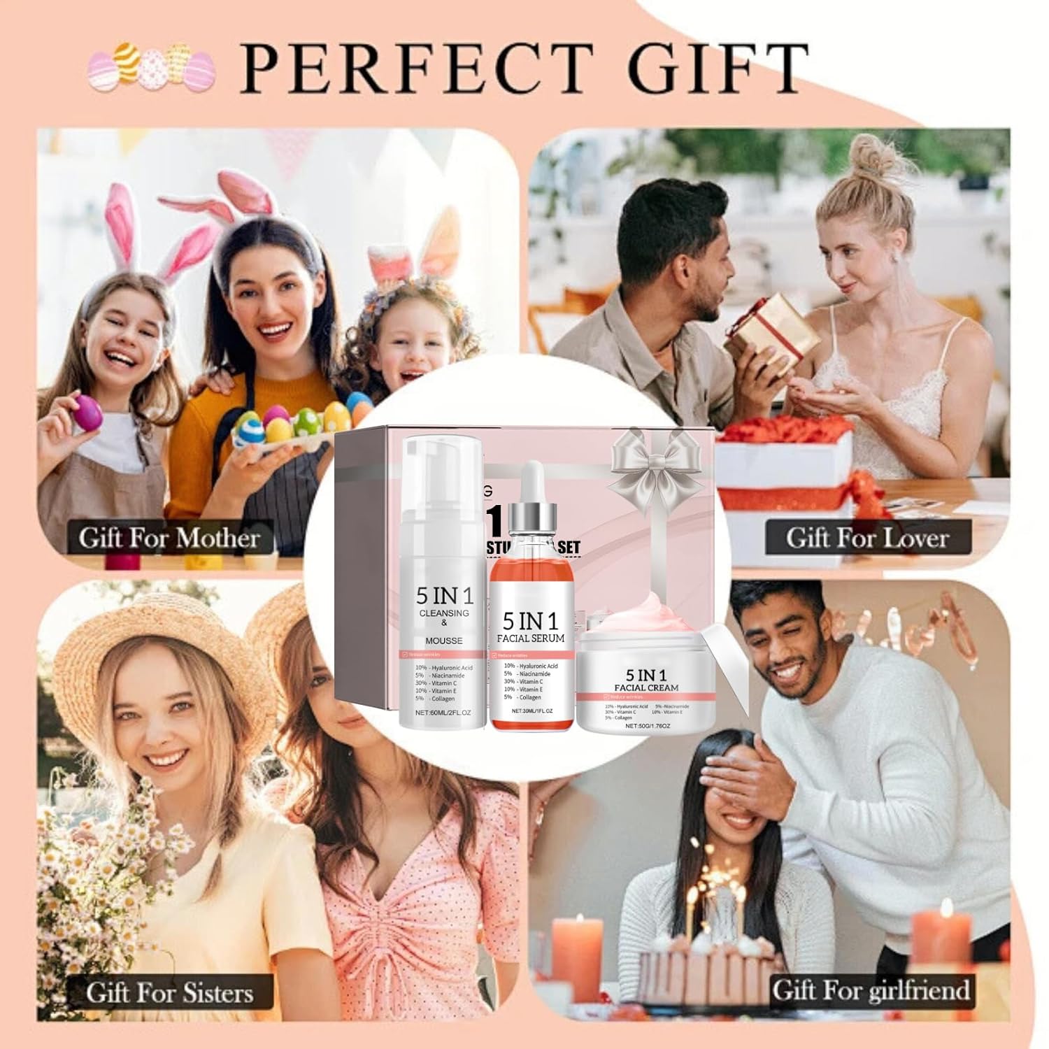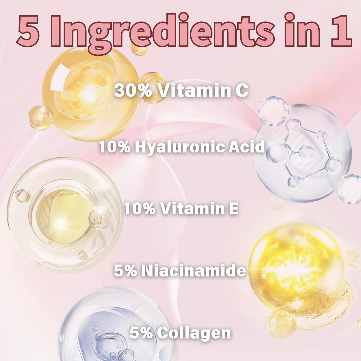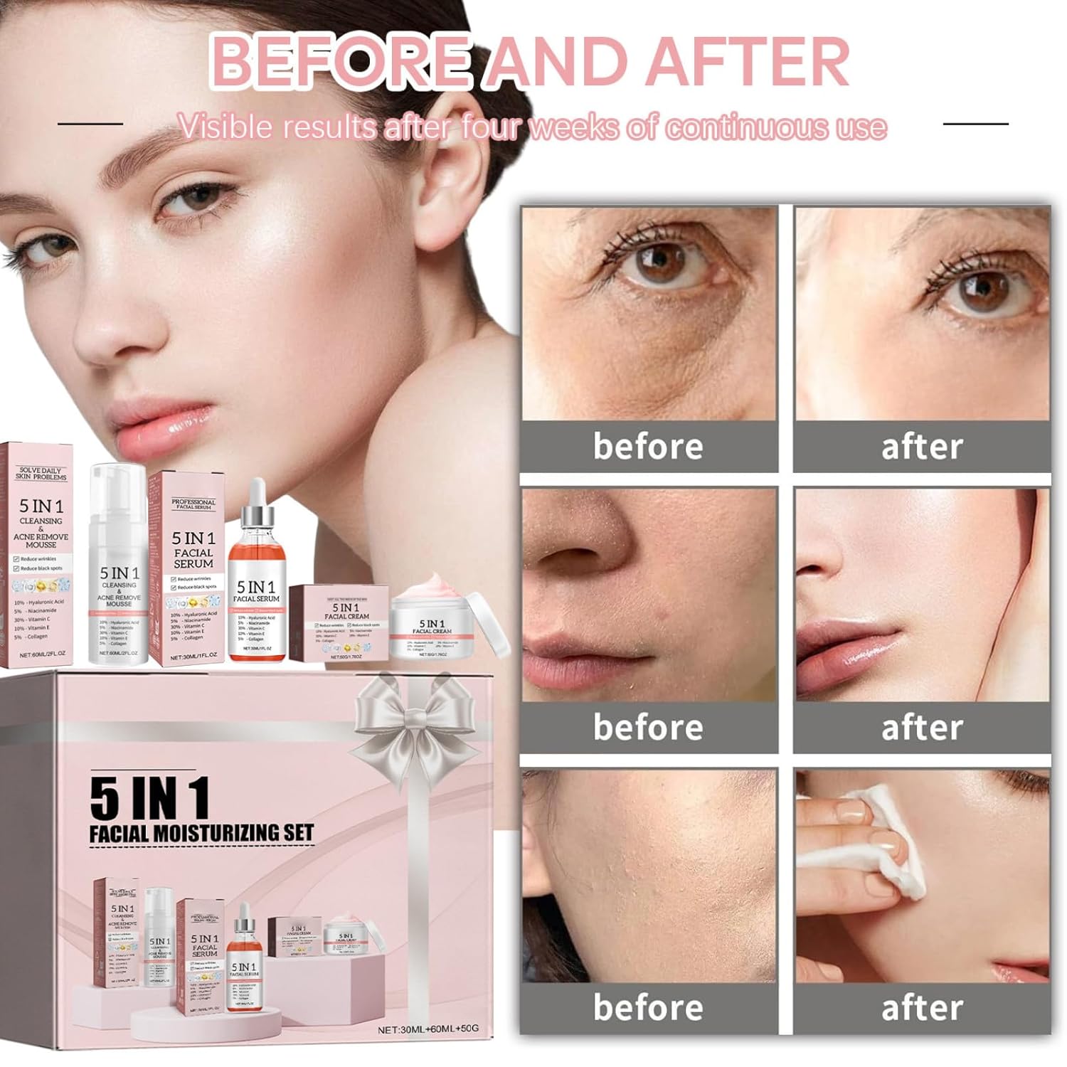 【5 Ingredients In 1】 Each item in the face skin care routine kit for women acne treatment has 10% Hyaluronic Acid, 5% Niacinamide, 30% Vitamin C, 10% Vitamin E, 5% Collagen. These five ingredients in hydrating skin care sets & kits face care can shrink pores, reudce fine lines and moisturize the skin, making skin more soft, smooth and elastic