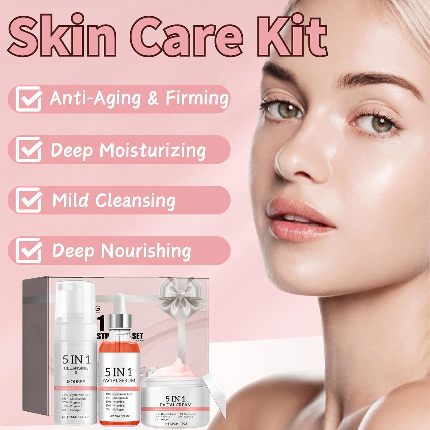 Skincare Kit Girls Gifts – 3PCS Skin Care Set Moisturizing – Smooth Skin Care Kit – Anti Aging & Firming Skincare Set – Spring Gifts for Women – with 5IN1 Face Cream, Face Serum & Cleansing Mousse