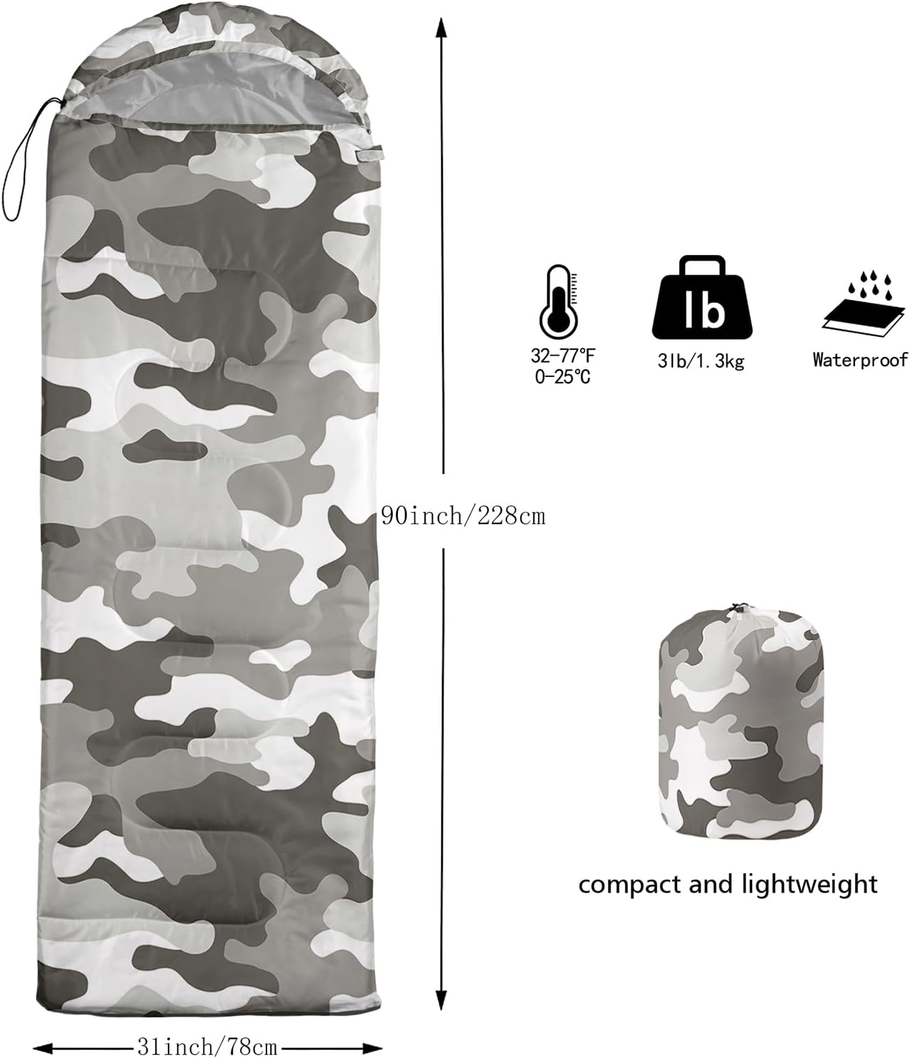Sleeping bags For All Seasons- Our camping sleeping bags are designed to give you a good night’s sleep. Ideal for spring,summer,fall,and winter,rated from 32°F to 77°F (optimal comfort temperature is 50°F to 65°F). Stay comfortable and warm in any condition at normal altitude. Can be used for any outdoor adventure,class camping,summer camps,couch surfing,indoor blanket,and as an emergency blanket for vehicles.