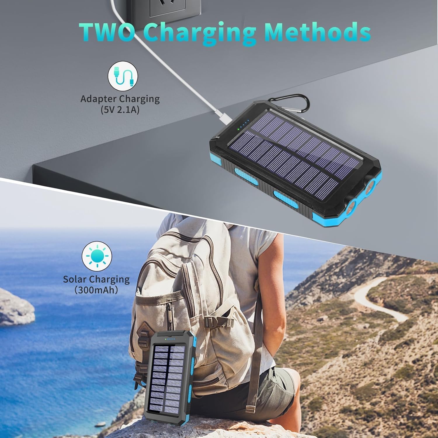 【Dual Recharge Methods】Solar Charger Power Bank via Solar Panel( 5V/300mA ) or 5V/2.4A (Type-C). Solar charging is a charging way for emergency use, and solar panel charging efficiency will be influenced by natural conditions and random factors, such as day and night, geographical latitude and height above sea level, sunny and rainy, and so on. so we are more recommended to charge it via USB cable and only use the solar charging feature in an emergency.