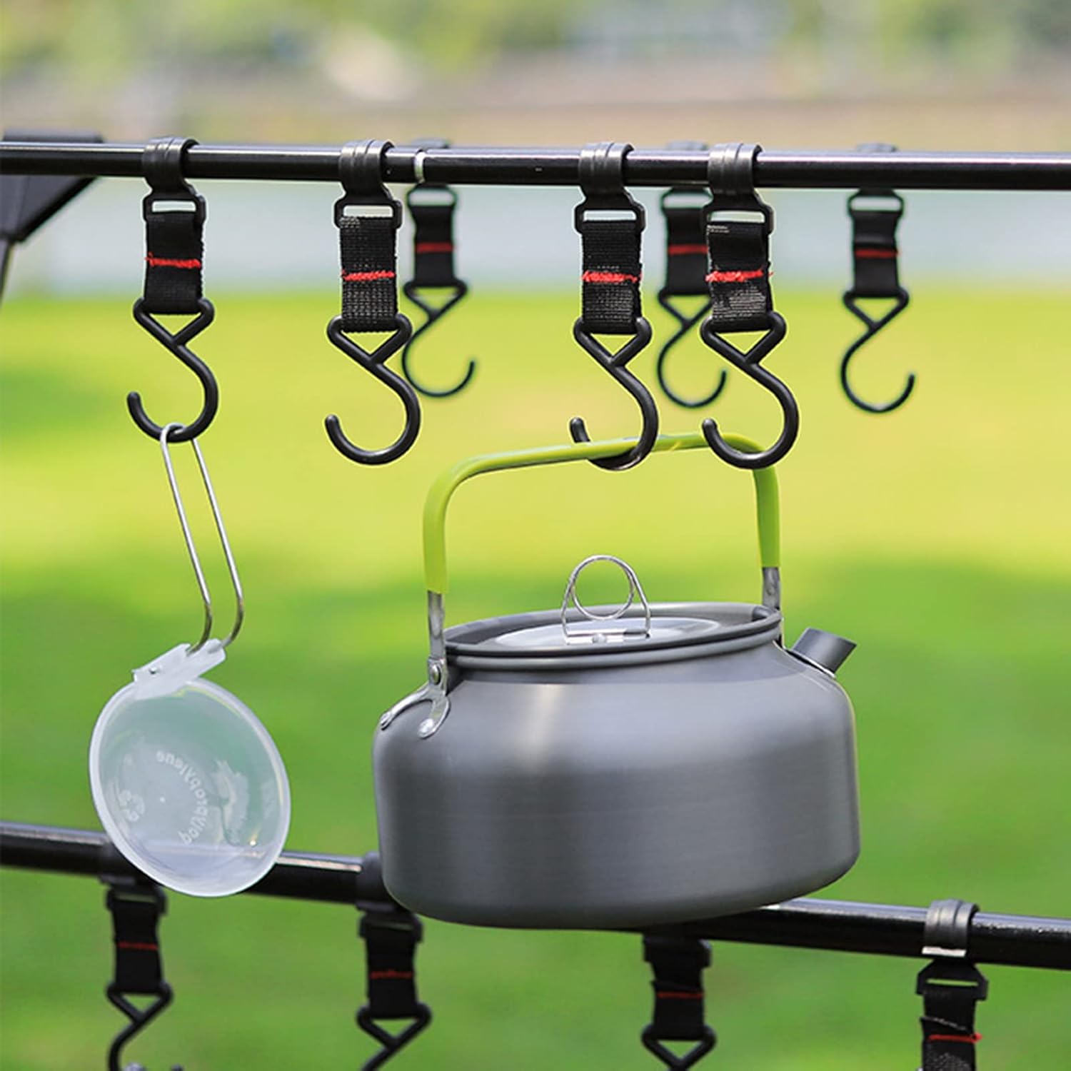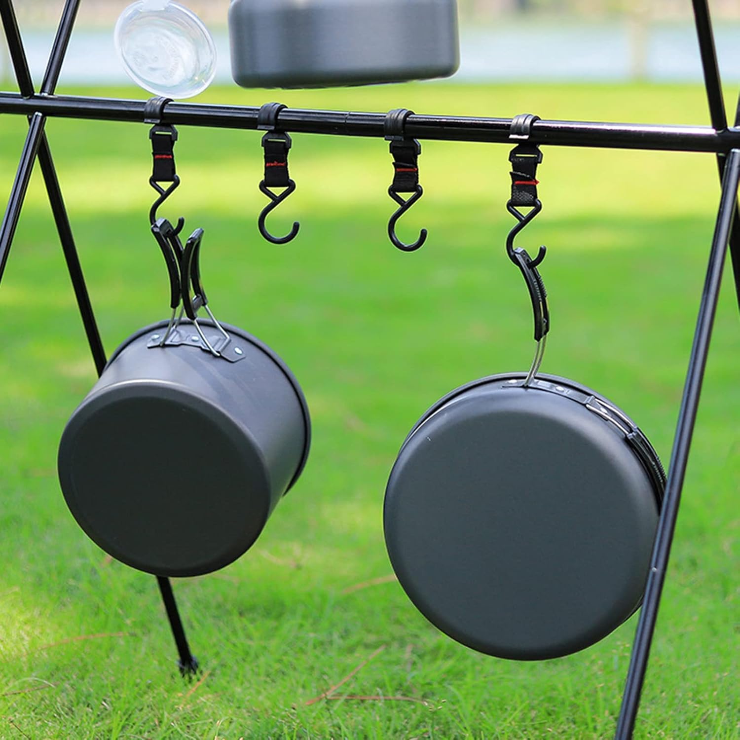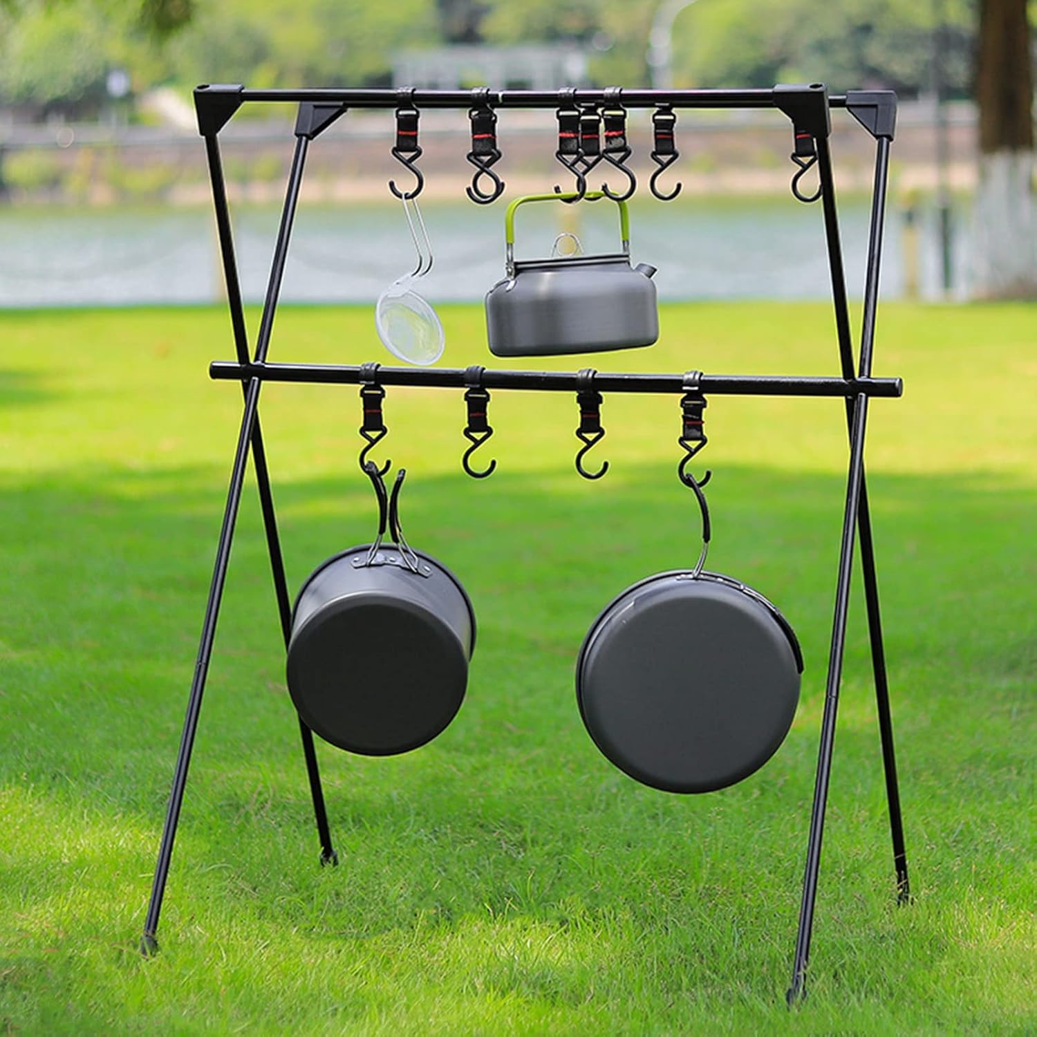 VERSATILE HOOKS: Equipped with multiple hooks, the Camping Hanging Rack allows you to easily hang your pots, towels, bowls, and more. This functionality makes it good for organizing your camping gear or keeping items accessible during outdoor cooking. Use it freely to enhance your camping experience and make the most of your space