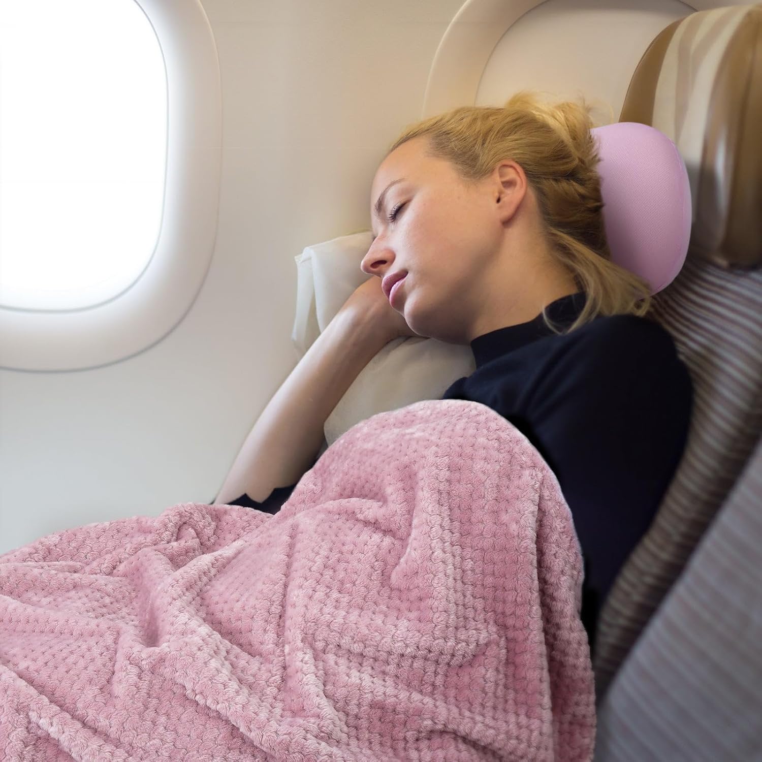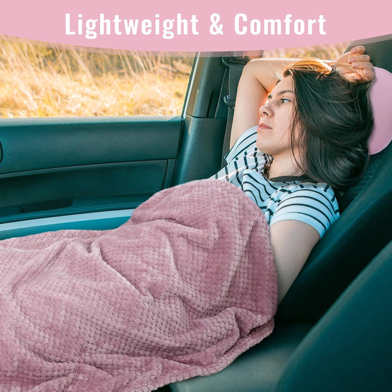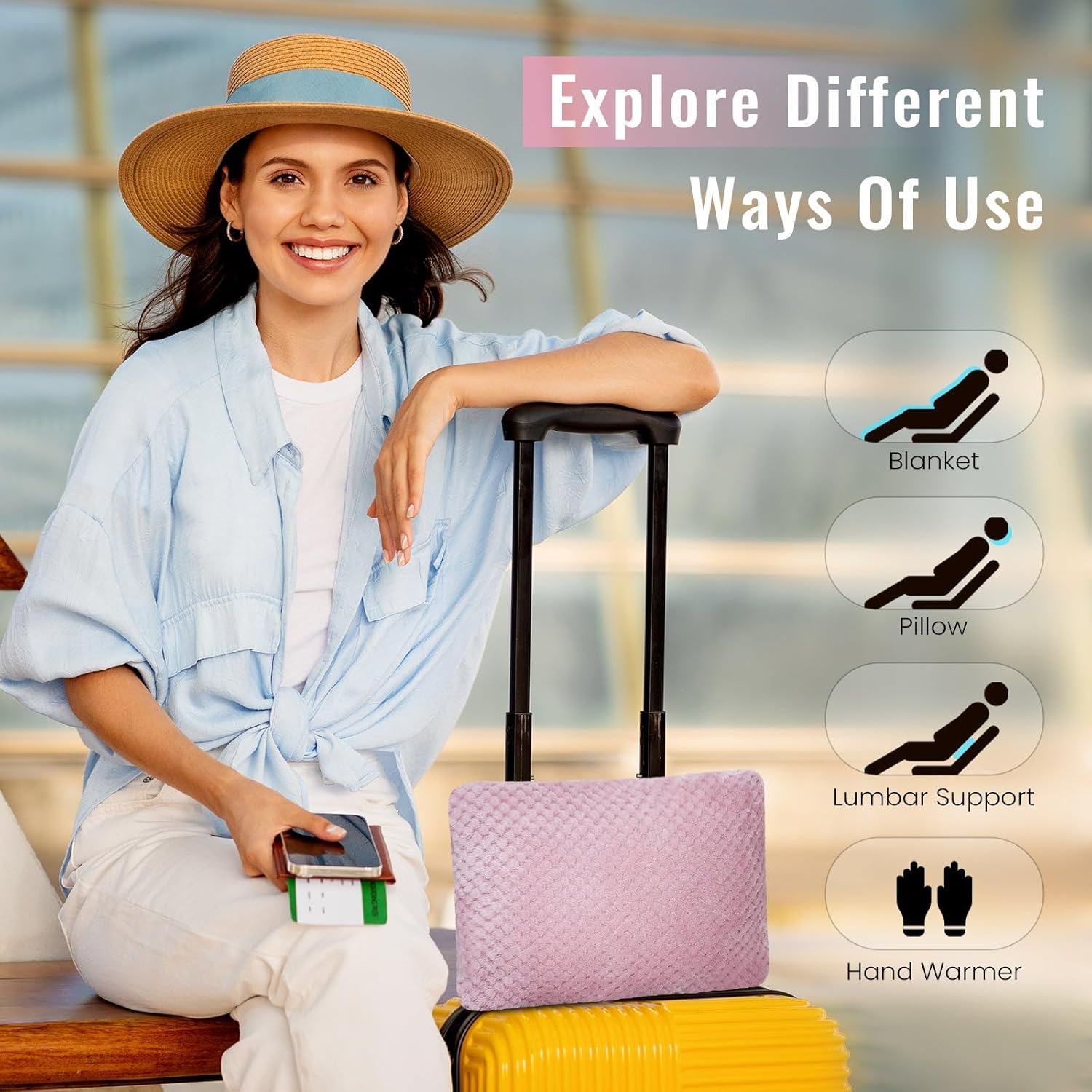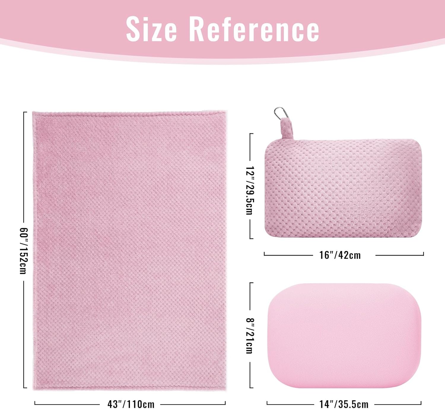 Travel Pillow Blanket Set-3 in 1 Travel Pillow Memory Foam, Soft Travel Blanket Airplane Compact with Bag, Inner Pillowcase, Hand Luggage Belts and Backpack Clip, for Plane Car, Pink