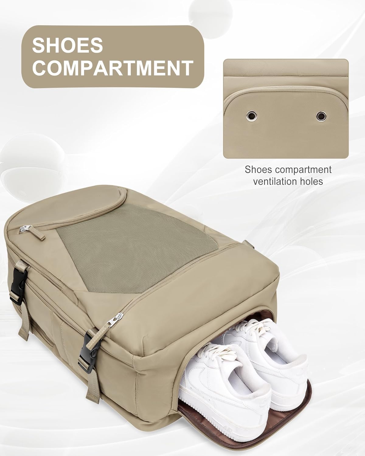 【Shoe Compartment & Wet Bag】 This computer backpack has a separate shoe compartment at the bottom to keep shoes and other items separate and clean. And there are two ventilation holes to keep it breathable and odor free. The interior of the backpack features a wet pocket for toiletries to help keep your wet and dry items separate.